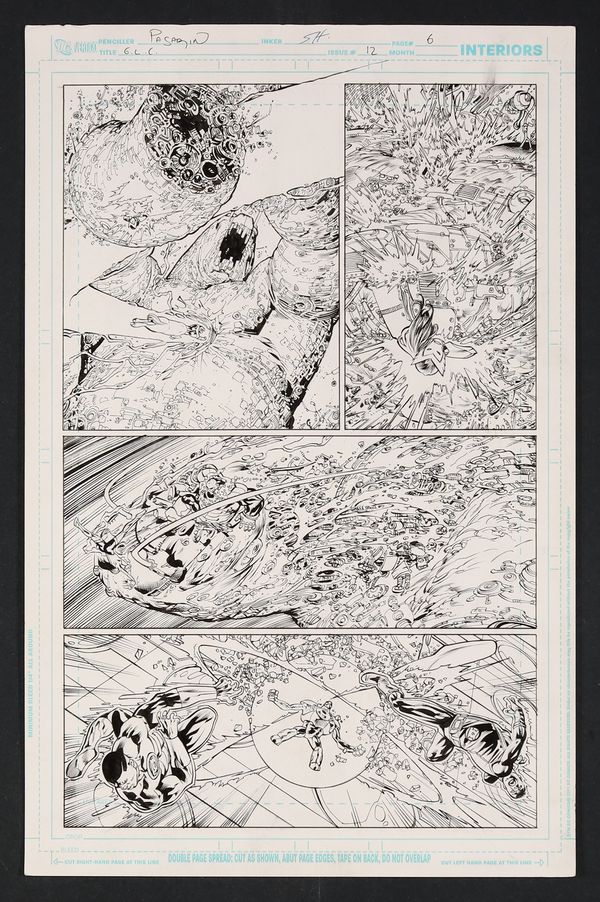 The war between the members of the Corps and the Alpha Lanterns (and of course, the Guardians directing them from the shadows) reaches epic proportions! After John Stewart was sentenced to death by the Alpha Lanterns, he escaped with some help from Guy and the pair raided the depths of Oa for a way to fight back- and return with an army of reprogrammed Manhunters who merge and form a giant monstrosity! In this wonderfully detailed fight page, we see lead Alpha Lantern Boodika taking on the mechanical menace while Guy and John are blasted by Alpha Lantern Varix in the last panel. Pencil and ink on DC Comics art board. 11" x 17".