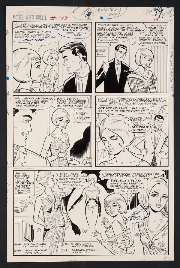 "Even these gorgeous gowns can't drive the gloom from my heart!" Millie opines as she longs for her long-time photographer Clicker, who's been replaced by an executive's son. A nice fashion panel here with reader designs worked into the story! Pencil and ink on art board. 13 1/2" x 20 1/2".
