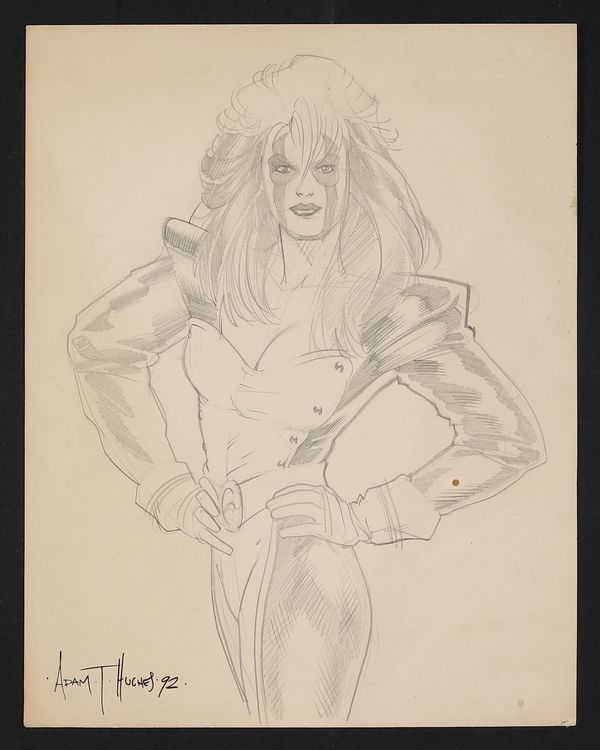 One of the great artists of the modern era, Hughes' trademark style is on full display in this piece created five years into his career- bold, clean-lined figurework, lively eyes, and rich shading make this figure pop off the page. Signed by the artist. Pencil on art board. 11" x 14".
