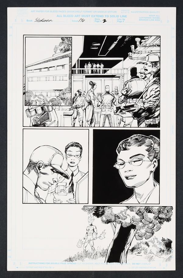 As the final issue of this series opens, former Herald of Galactus Firelord has come to the Asian nation of Kakistia to "celebrate life with the vast and varied creatures" found on Earth. Unfortunately for him, those creatures include humans- including those of the Kakistian government who are about to test a nuclear weapon on the very spot he's standing. Pencil and ink on Marvel Comics art board. 11" X 17 1/4".
