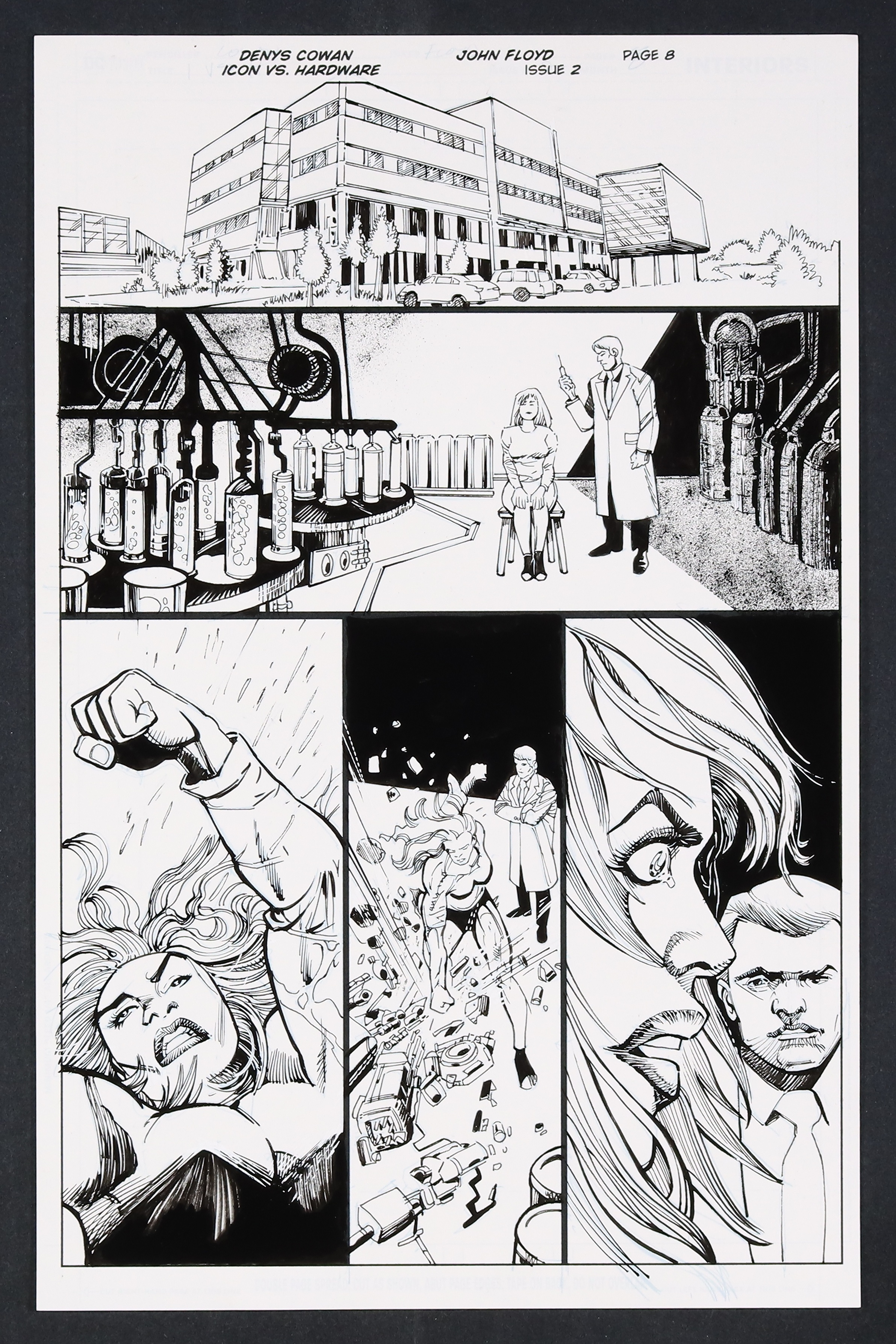 As Curtis Metcalf (Hardware) begins to get Alva Industries in order as its new CEO, trouble is afoot at an Alva lab in Sadaqah! A test subject is injected with the experimental Q Juice giving her super strength. All seems to be going well until the last panel where we can see the look of terrible realization cross the woman's face. Ink over printed pencils on comic art board. 11" X 17".