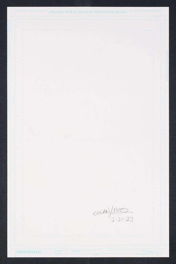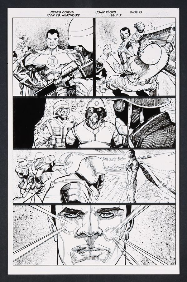 Less than impressed with these newly manufactured super soldiers, Icon demands that they end their long-running war. After they refuse his request to stand down he decides its time for a more hands on approach. He's not mad he's just disappointed. A fantastic final panel on this page with a close shot of Icon completely unaffected by the bullets and energy blasts. Ink over printed pencils on comic art board. 11" X 17".