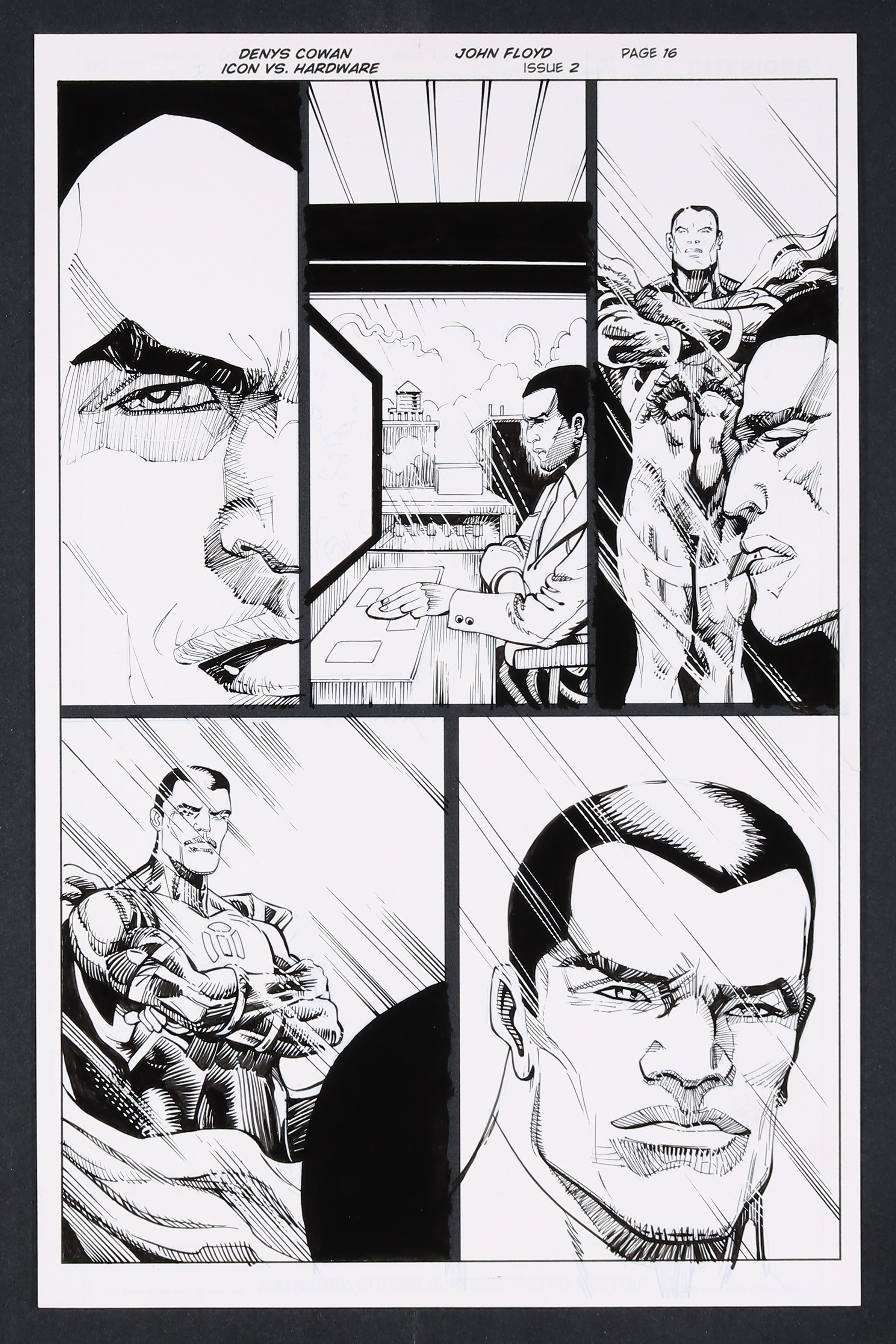 As Curtis Metcalf (Hardware) watches live footage of Icon stopping a war he helped start, he finds himself suddenly faced with the super-powered man himself! A tense page that marks the pair's meeting in this 'new' reality formed by Hardware's time-travelling. They're both heroes, surely they'll work out their differences with words, right? Ink over printed pencils on comic art board. 11" X 17".