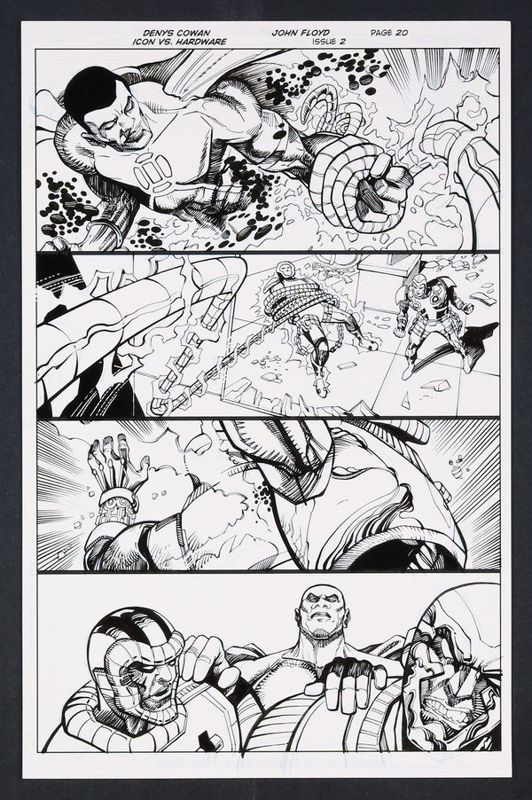 With the Hardwares thinking they've got the upper hand, Icon takes the gloves off to show them exactly how powerful he is. A great sequence here with Icon breaking free from Hardware's plasma whip and instantly appearing behind the two- no more holding back! Ink over printed pencils on comic art board. 11" X 17".