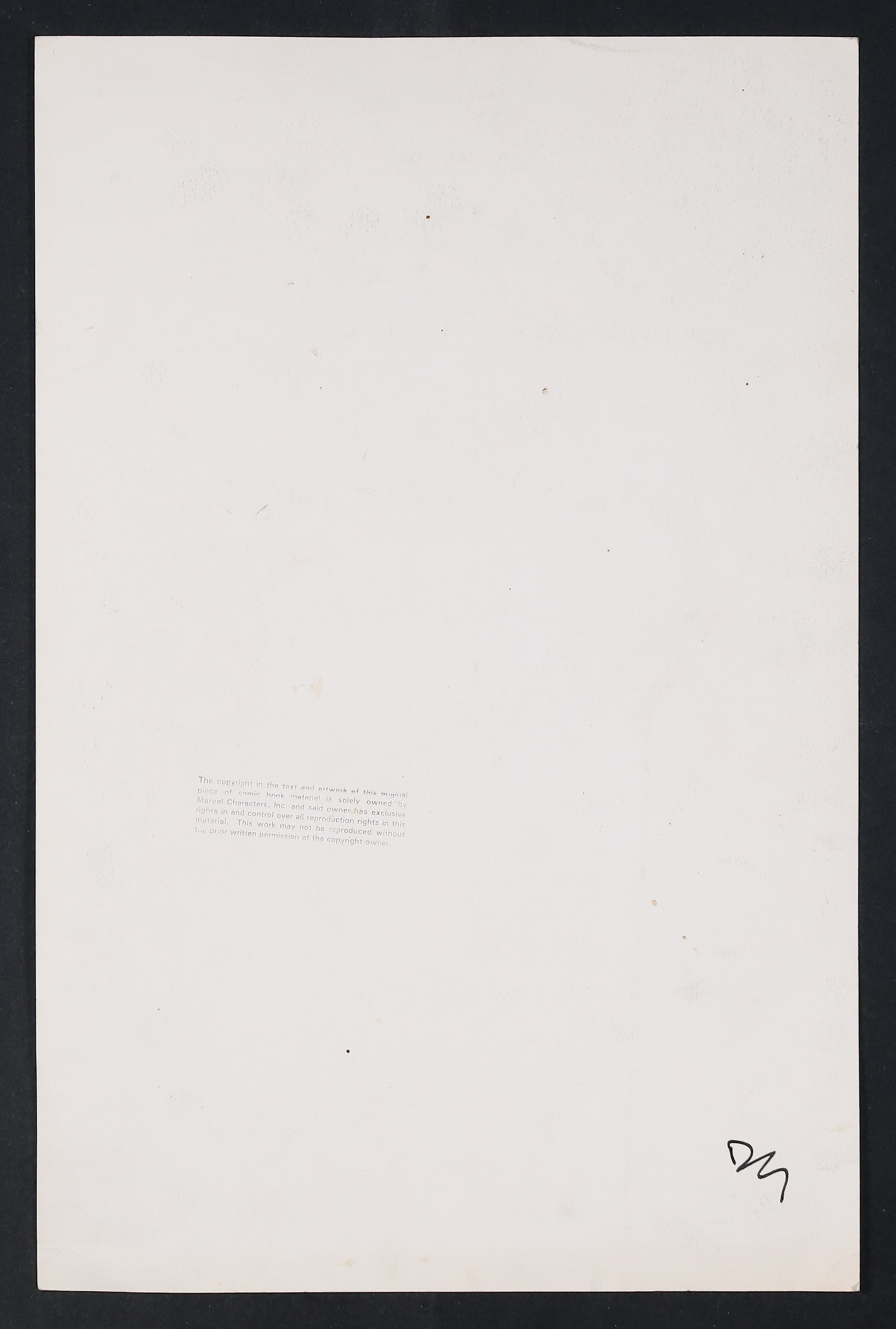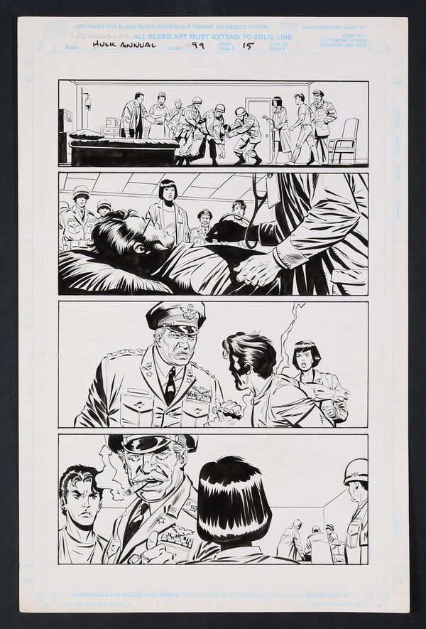 You might call this page the calm before the storm! In a hard cut from the previous page in this retelling of the Hulk's origin, Bruce Banner had knocked Rick Jones to safety and taken the full brunt of Gamma radiation himself. In the aftermath, both Banner and Jones are returned to base with a furious General Ross demanding answers and Betty attempting to keep the peace. Pencil and ink on Marvel Comics art board. 11" x 17".