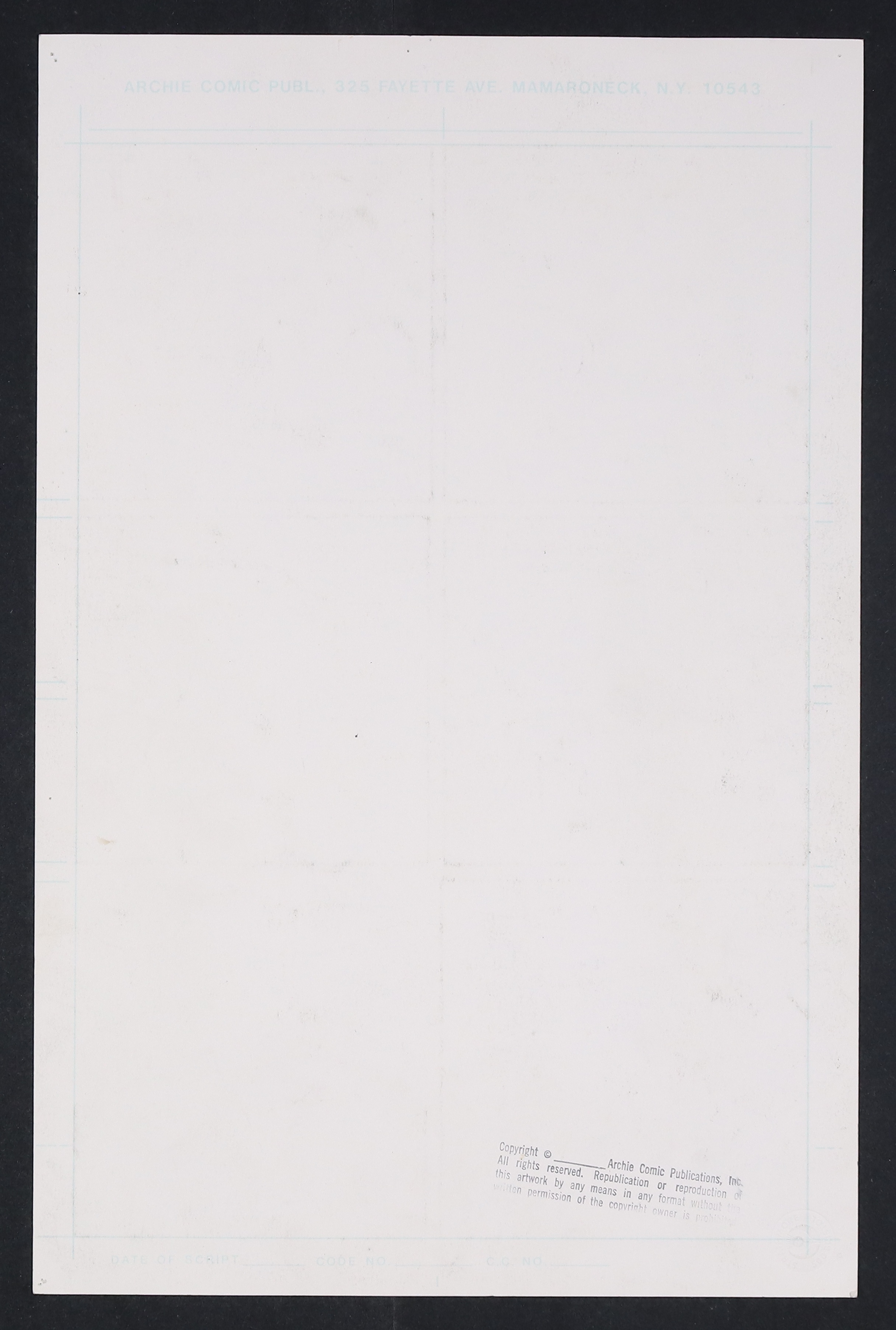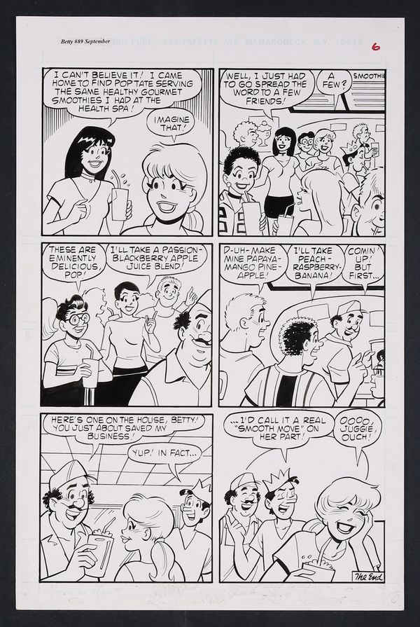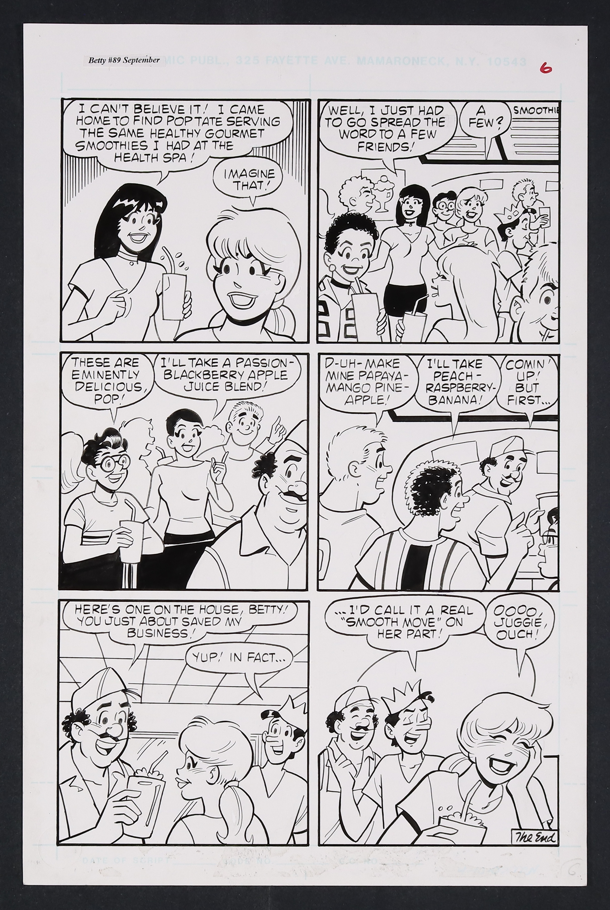 Though a heat wave should create prime conditions for an ice cream purveyor like Pop, Veronica Lodge's wellness-influencing has kept the crowds away. Thankfully, Betty introduces Pops to the concept of fruit smoothies, packing the booths at Pop's! Pencil and ink on Archie Comics art board. 11 1/4" x 17 1/4".