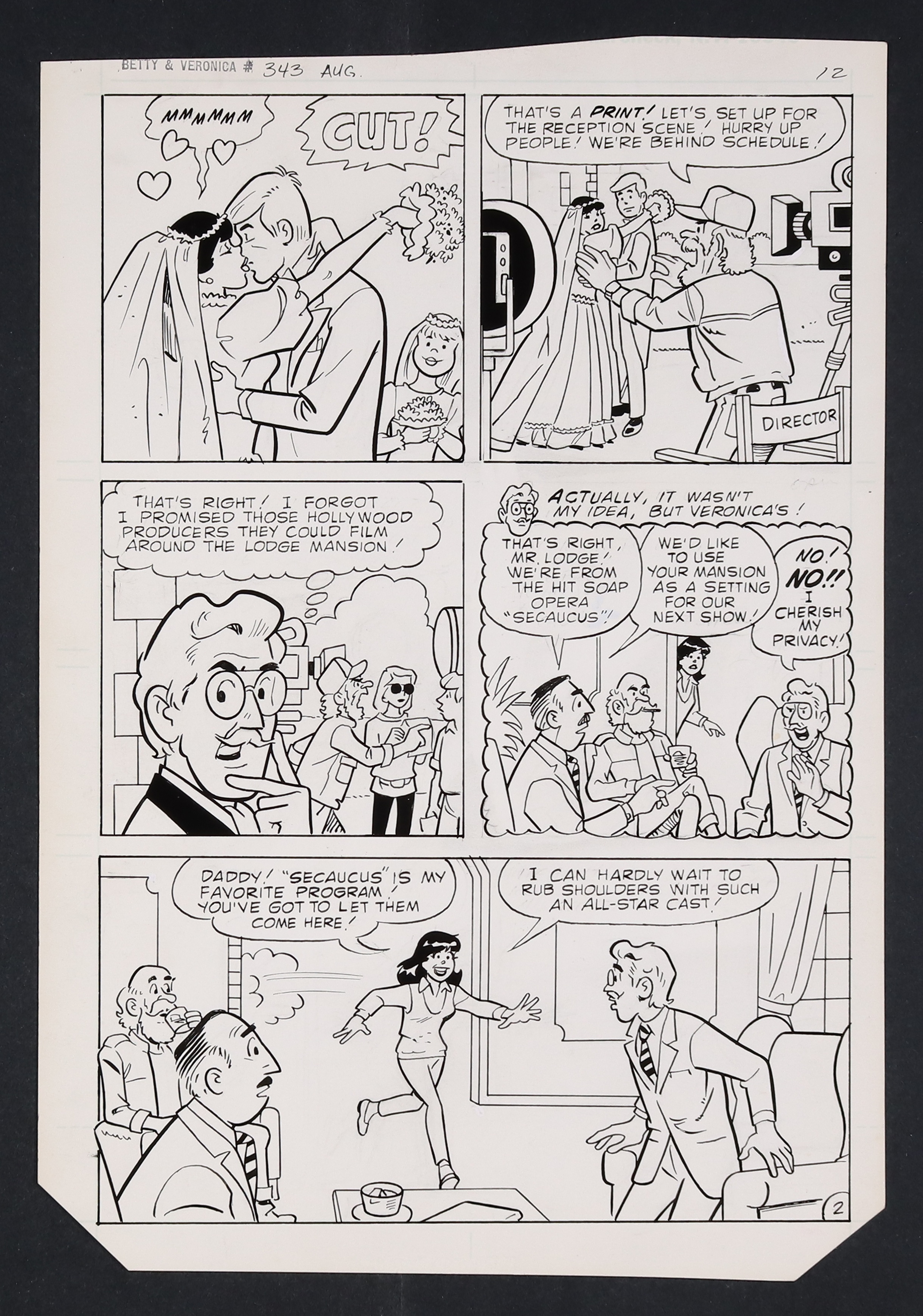 The wedding of Veronica Lodge! Well, kind of. Ronnie's begging convinces her father to allow the hit soap "Secaucus" to film in Lodge mansion, as well as landing her a role as J.R. Wingding's soon-to-be-dead bride. Will the glitz and glamour of TV production be everything Veronica hopes? No, no it won't. Pencil and ink on Archie Comics art board. 11 1/4" x 16 1/2".
