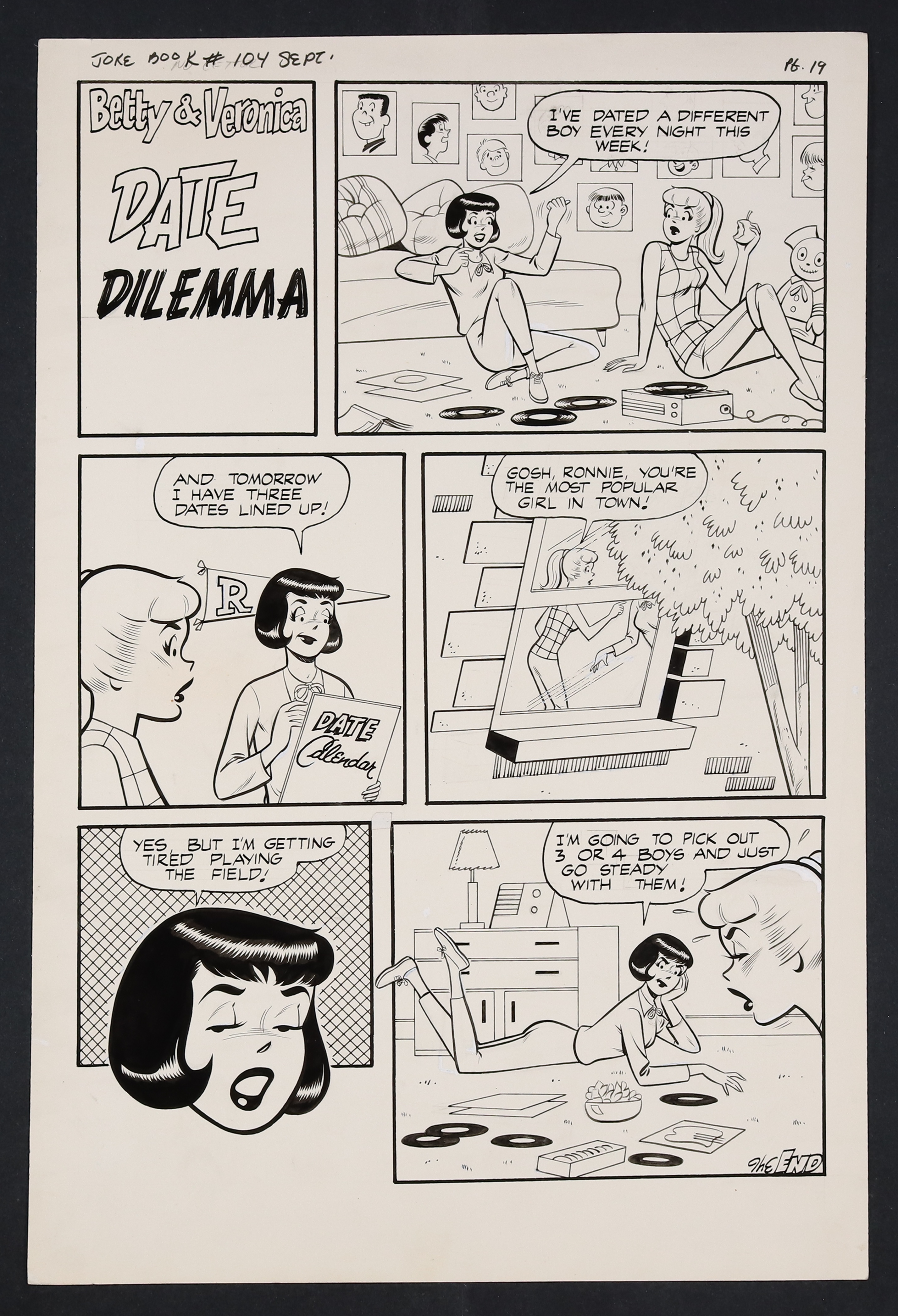 Riverdale's premiere best frenemies look fantastic in this one-pager that highlights Veronica's dating philosophy. Absolutely stunning inks on this one and the final two panels, with the closeup on Ronnie and the playful panel break really make this page pop. Pencil and ink on art board. 13 1/2" x 20". NOTE: The art for this page is uncredited, but it is believed to be by Dan DeCarlo.