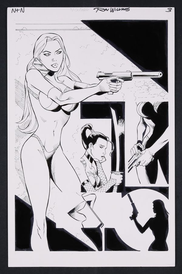 A beautifully laid-out page that captures appeal of this comic perfectly- women and weapons! Williams does a nice job on this page, using the central image of Nyce checking her gun to frame the inset panels and capping things off with a great silhouette panel. Signed by the artist in top margin. Pencil and ink on art board. 11" x 17".
