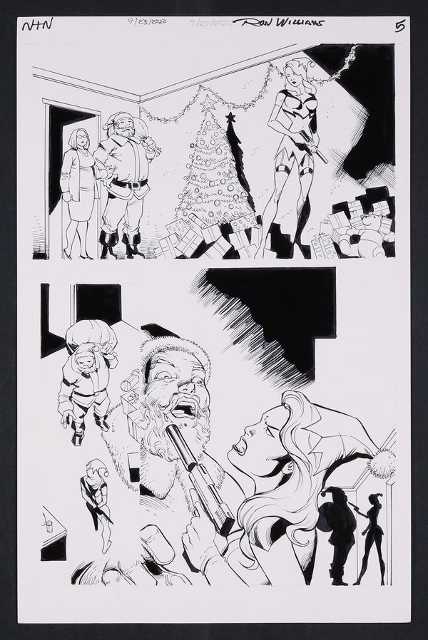 Nyce makes the naughty list! A great Christmas page with a fantastic closeup shot of Nyce shoving her silenced pistol in Santa's face! Signed by the artist in top margin. Pencil and ink on art board. 11" x 17".