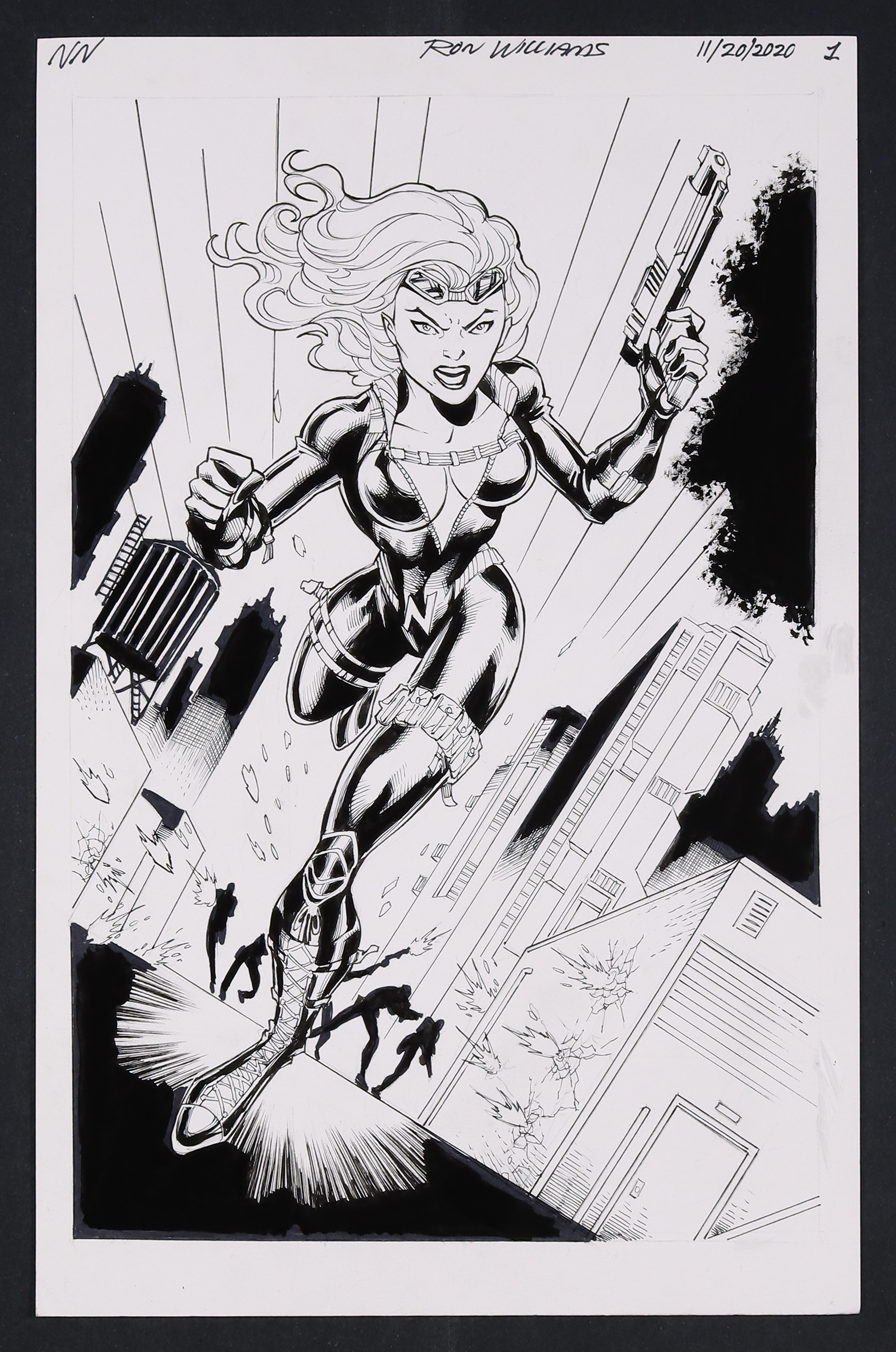 A fantastic action splash of Nastee, in full superspy gear, running from a hail of bullets being fired at her from behind! Signed by the artist and top margin. Pencil and ink on art board. 11" x 17".