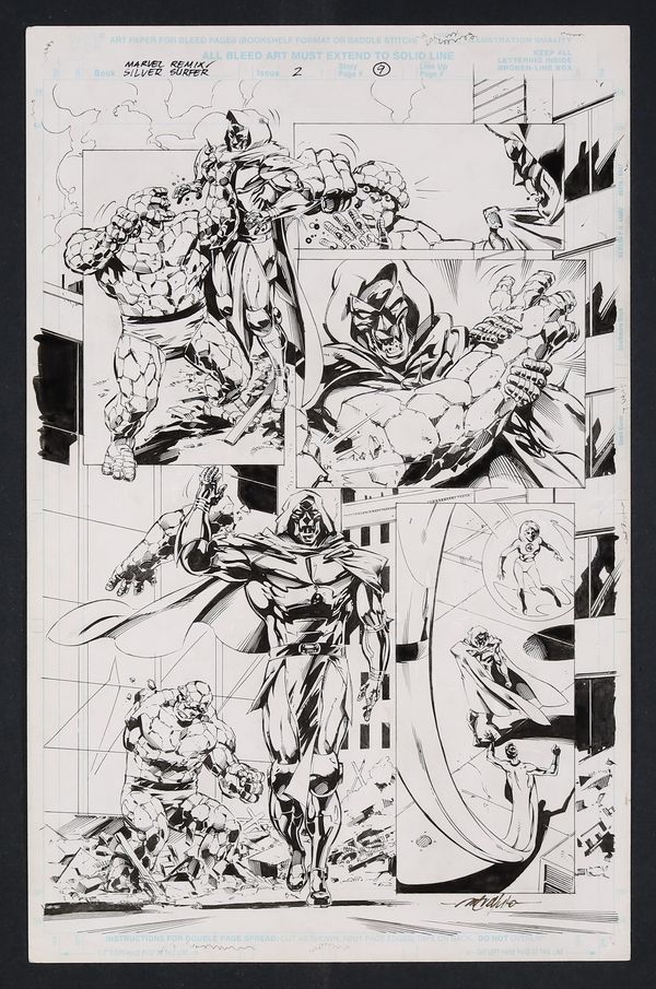 DOOM! A great page from this miniseries that 'remixed' the classic FF storyline where Doom stole the Power Cosmic from Silver Surfer. Here we see the souped up Doom confronting the FF in their hometown of New York. Having already dispatched the Human Torch, Doom faces the The Thing and simply...snaps his arm off. It's a simple scene which in many ways enhances the horror of what Doom does. Velluto and Geiger are a great team, filling the page with a liveliness and sense of motion. Signed by Velluto in lower right. Pencil and ink on Marvel Comics art board. 11" x 17 1/4".
