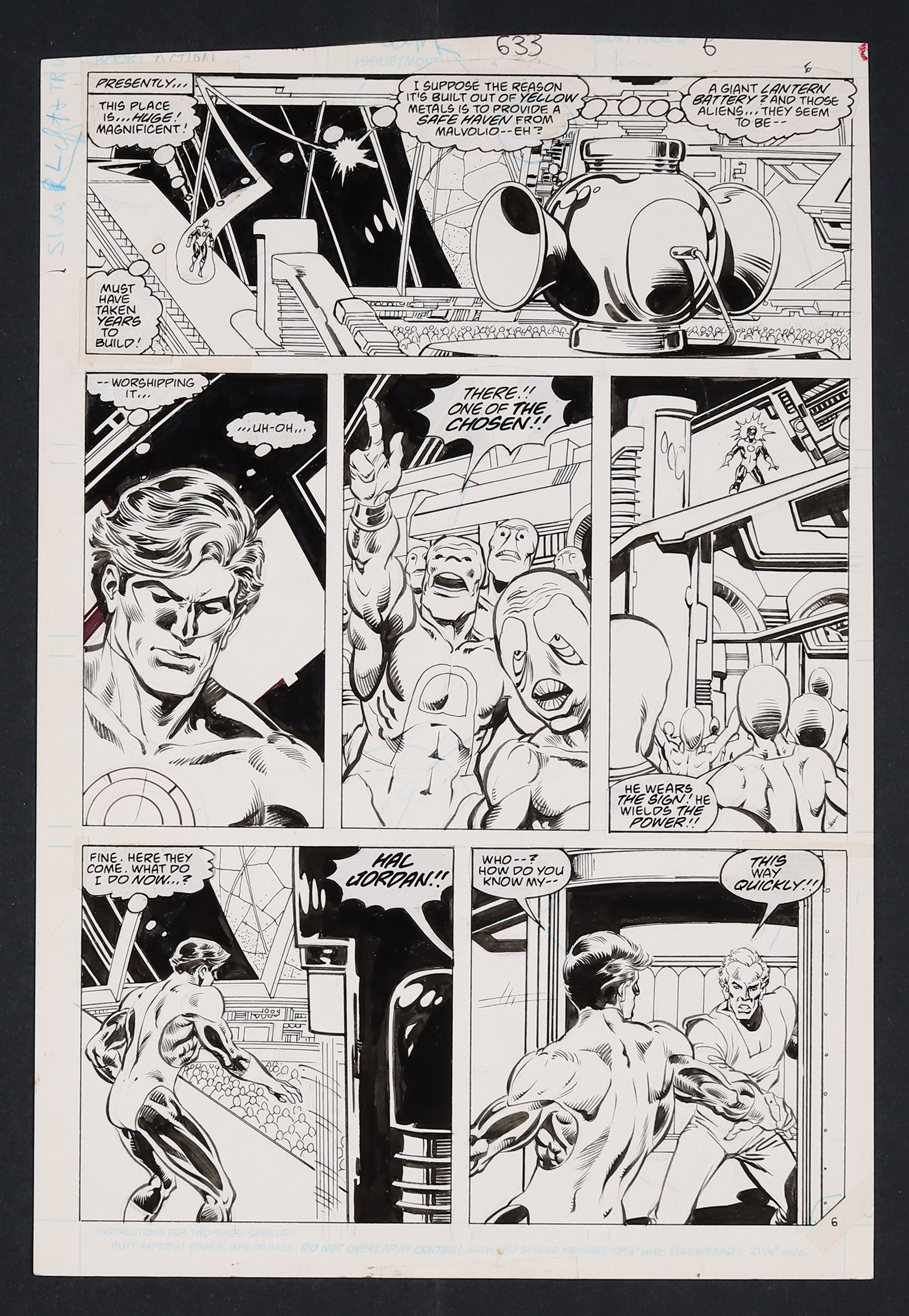 Having just been been punched through an entire planet , by the mysterious and powerful ring-wielding Lord Malvolio, Hal Jordan happens upon a massive golden space station which inside houses a Lantern Battery- and a crowd of people who seem to worship Green Lanterns! Things must be looking up for old Hal, right? Right? A nice sci-fi page that delivers some well-drawn alien scenery and creature design as well as a great closeup of Hal. Pencil and ink on comic art board. 11" x 16 1/4".