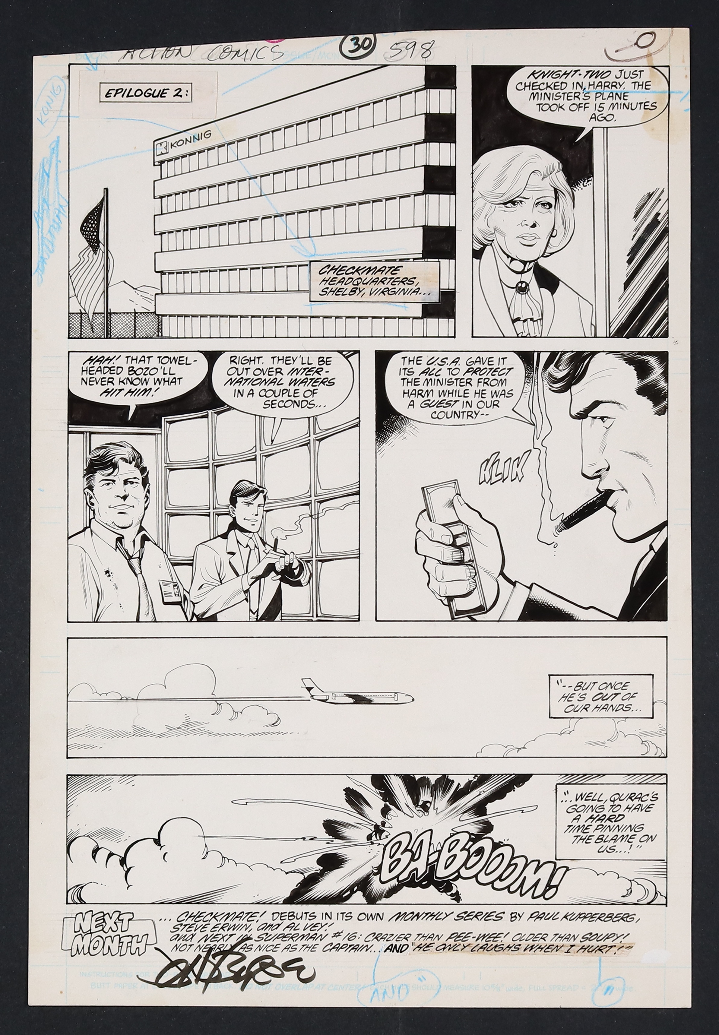 Espionage and superheroes collide in this issue which saw the Quracan minister of defense, accused of terrorist acts himself, abducted by a rival faction. Though he was saved by Superman and a mysterious man in a knight mask, it looks like Checkmate was playing a much longer game. Likely inspired by the Iran Contra story which was all over the news at the time, Byrne captures the strange dichotomy between the glib, cowboy attitudes of the intelligence agents of Checkmate and the dangerous games they're playing. Signed by Byrne in lower left margin. Pencil and ink on comic art board. 11" x 16 1/4"