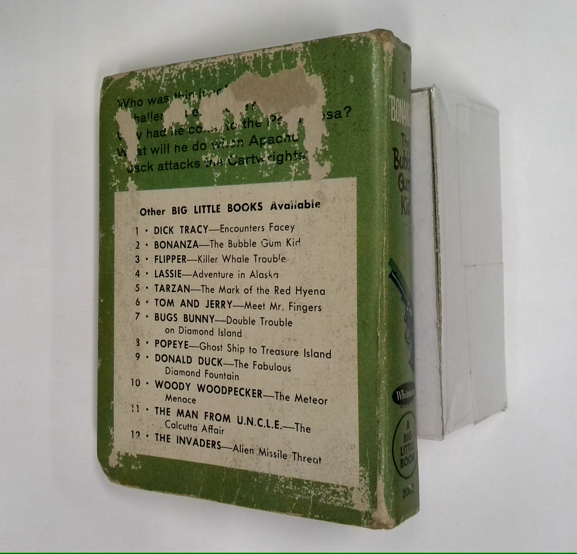 Tags: Big Little Books HC$27.00Bonanza The Bubble Gum Kid (big Little Book 1967) is a Big Little Book published by Western Publishing, Co. 250 pages, color pictures with text, 3.5-in. x 4.75-in., newsprint with hardcover, with $0.39 cover price. Cover price $0.39.