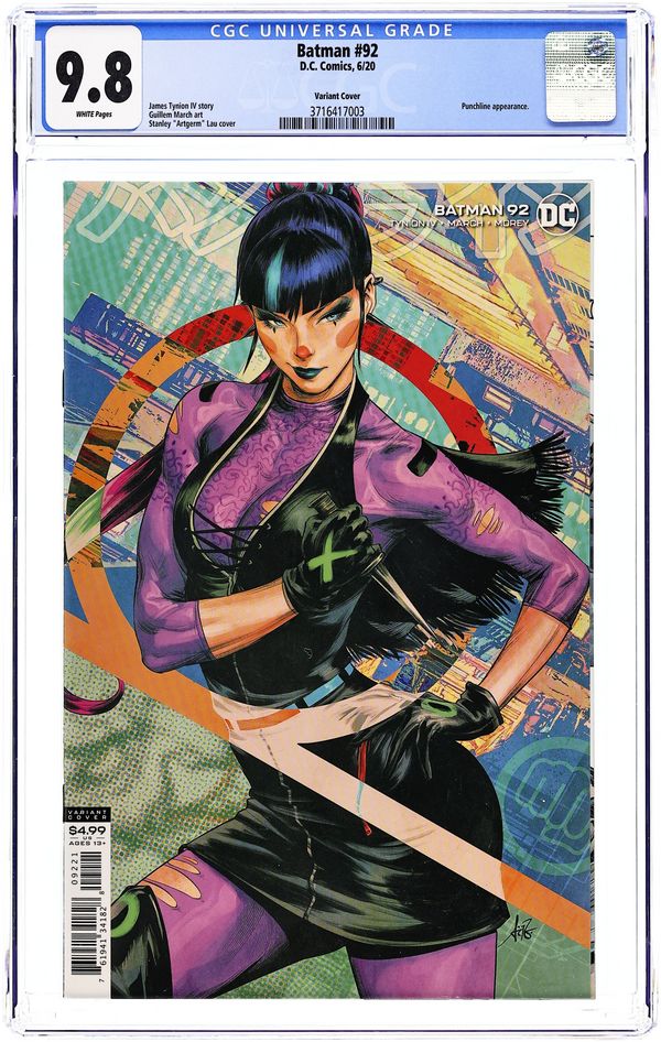 Comic Mint Exclusive Virgin cover by Shannon Maer - limited to 600 copies. The Joker War: Part 6 of 6. Written by James Tynion IV. Art by Jorge Jimenez, Carlo Pagulayan, Guillem March and Danny Miki. The Joker War comes to a city-shattering conclusion as Batman battles The Joker in a brutal, no-holds-barred duel! This is a fight 80 years in the making, and its outcome won't just change Batman's life -- it will change Gotham City for years to come! Plus, catch the first glimpse of the new villain known as Ghost-Maker! It's all in "The Joker War Finale" by James Tynion IV and Jorge Jimenez. And after the senses-shattering conclusion of The Joker War come a pair of back-up stories that will chart what's to come in this series and in Gotham City! Don't miss the first showdown between Batman and Clownhunter in "Intervention" by Tynion IV, Carlo Pagulayan and Danny Miki, plus "Dead Ringer" by Tynion IV and Guillem March, which leads into Punchline Special (2020 DC) #1. 56 pages, full color. Ages 13+