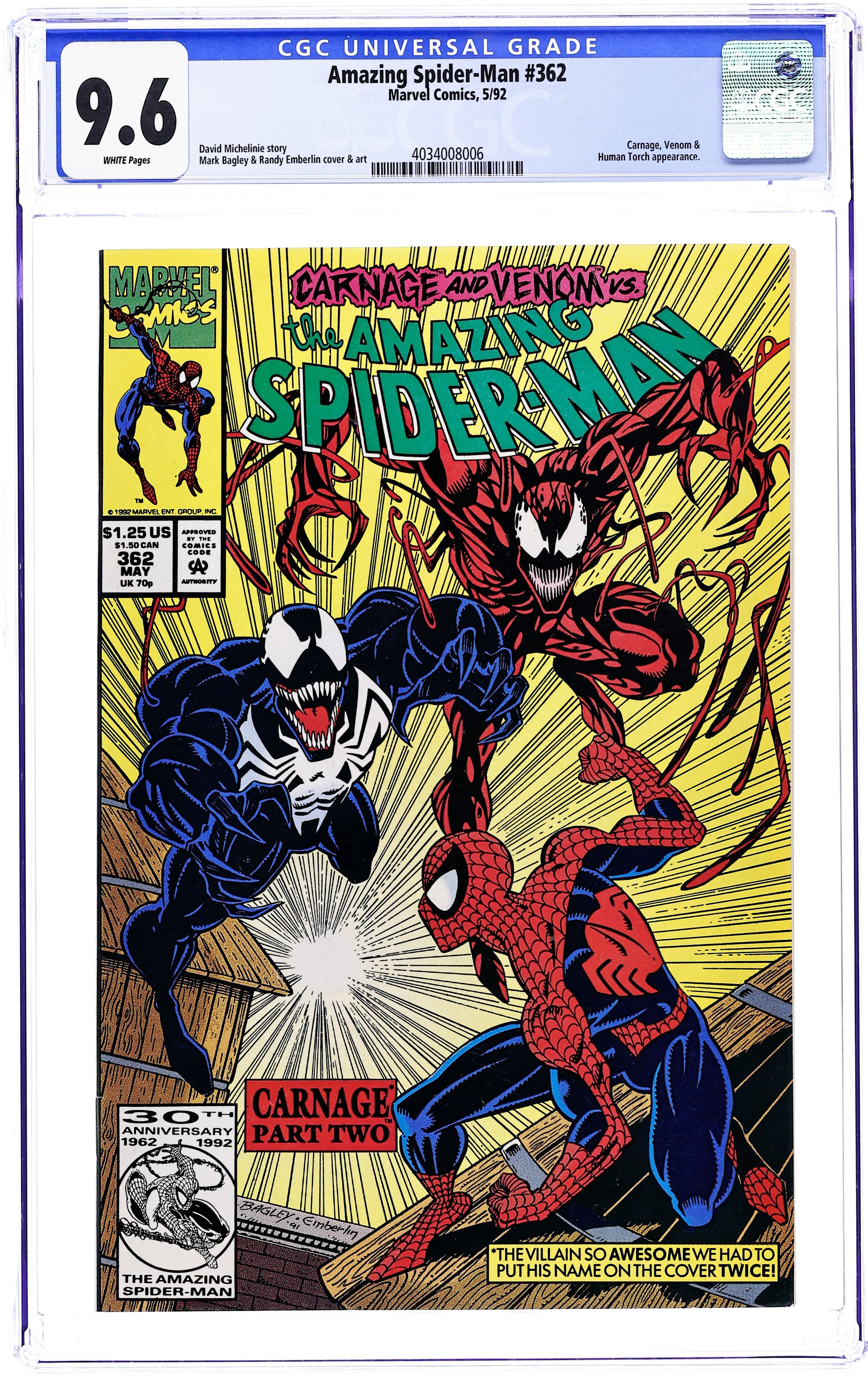Direct Edition. "Savage Grace!" Part 3 of 3. Script by David Michelinie. Pencils by Mark Bagley. Inks by Randy Emberlin. Cover by Mark Bagley and Randy Emberlin. Carnage takes J. Jonah Jameson hostage and drags him to a heavy metal concert at Madison Square Garden! The psychotic killer plans to execute JJJ in front of thousands of headbangers! But before Carnage can deliver the deathblow, Spider-Man and Venom strike! The ferocious fight leads into the subway tunnels and then back onto the concert stage! Where thanks to MSG's awesome sound system, the web-slinger tries to knock out both Carnage and Venom! The wall-crawler's ploy better work, because double-crossing Venom could have lethal consequences! A fantastic finish! First appearances of the Richard Parker and Mary Parker life model decoys (LMD's). Cameo appearances by Joe Robertson, Mr. Fantastic, and the Human Torch. (Notes: Venom appears next in the one-shot: Spider-Man Special Edition -- The Trial of Venom (1992). Carnage returns in the first issue of Spider-Man Unlimited (1993 1st series) to kick off the Maximum Carnage saga.) 36 pages. $1.25 cover price. Cover price $1.25.