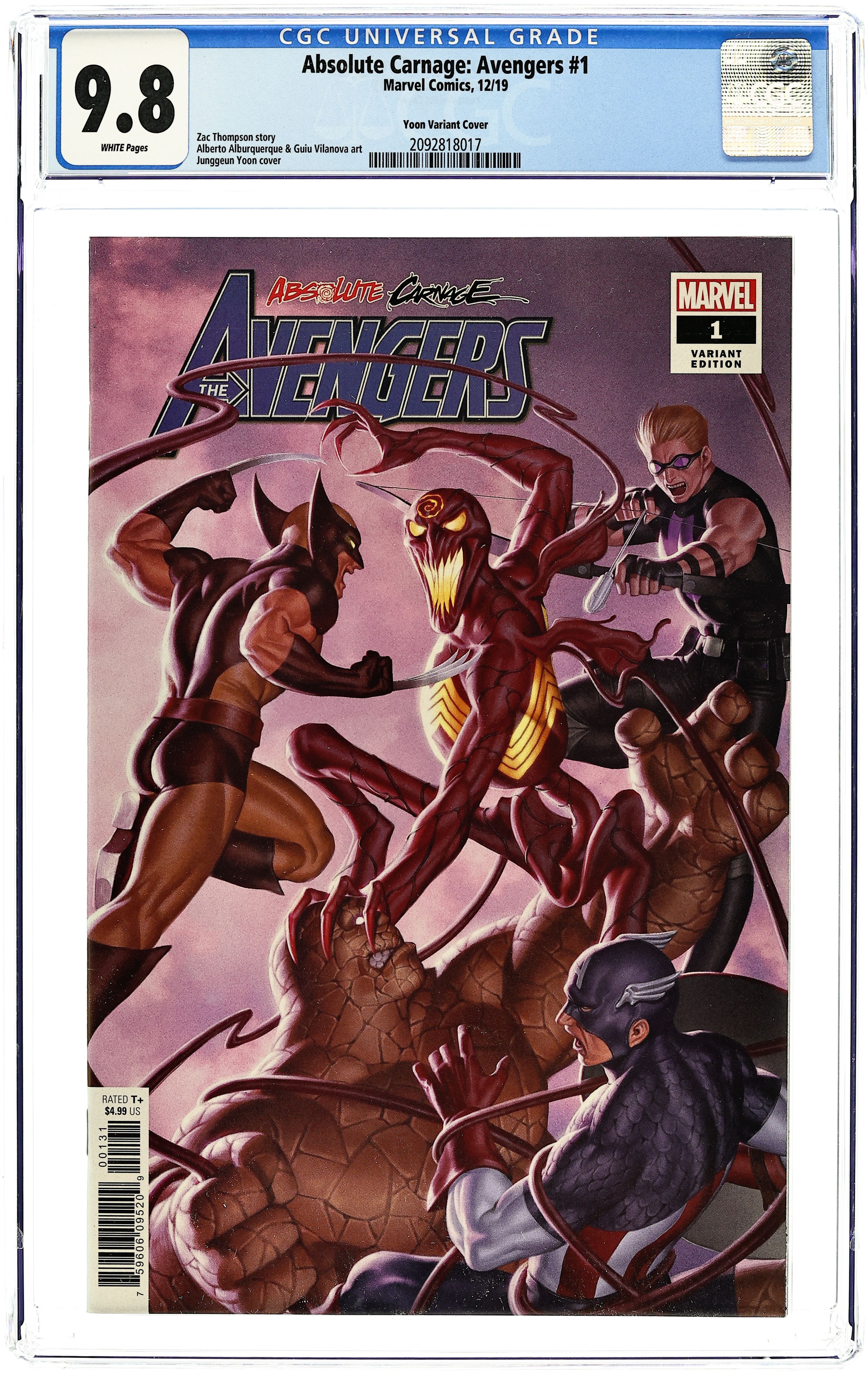 Limited 1 for 50 Retailer Incentive Variant Cover. Written by Leah Williams and Zac Thompson. Art by Alberto Alburquerque and Guiu Villanova. Cover by Jung-Geun Yoon. CAPTAIN AMERICA! HAWKEYE! THE THING! WOLVERINE! Years ago, Cletus Kasady used the Carnage symbiote to take over a small town called Doverton, Colorado, as well as the team of Avengers who arrived to stop him! Barely able to free themselves from his control during their first meeting, this small band of heroes will have no choice but to assemble once more after they discover that Doverton's entire population has recently fallen victim to Carnage's more lethal designs… 36 pages, full color. Rated T+ Cover price $4.99.
