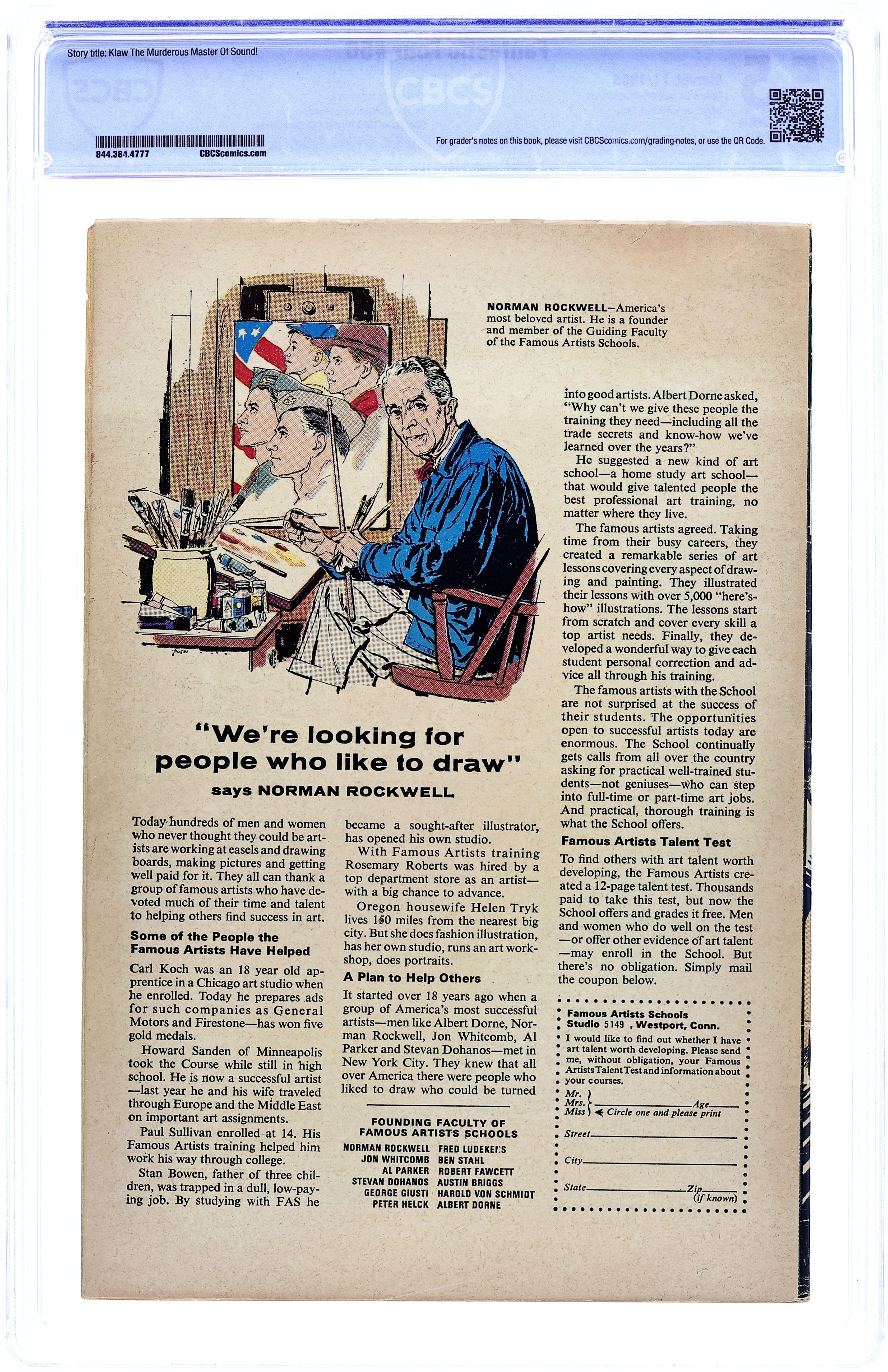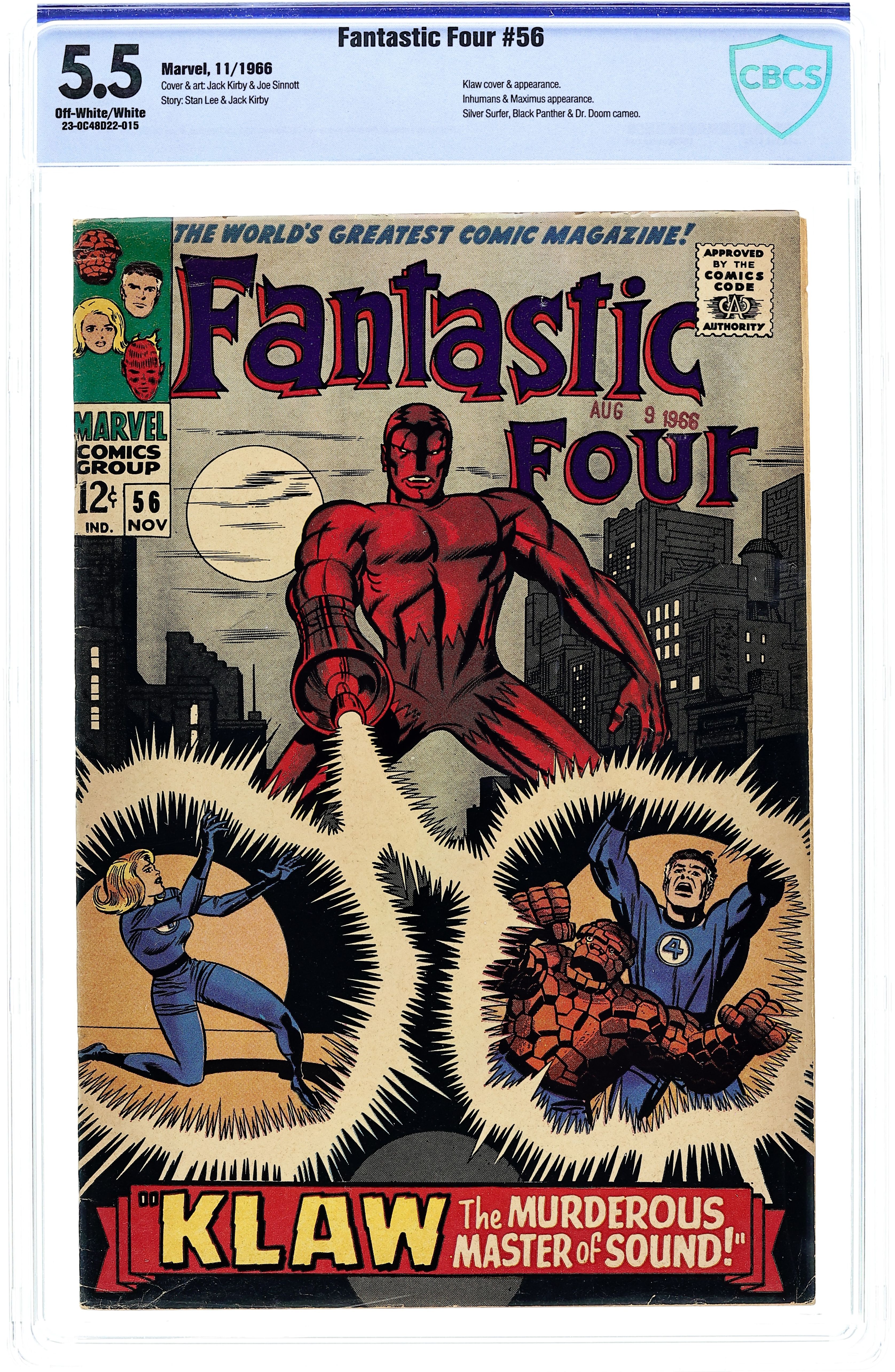 Cover pencils by Jack Kirby, inks by Joe Sinnott. Klaw The Murderous Master of Sound!, script by Stan Lee, pencils by Jack Kirby, inks by Joe Sinnott; Klaw attacks the Baxter Building. The Silver Surfer, the Inhumans, Doctor Doom, and the Black Panther all have brief appearances. 36 pgs. $0.12. Cover price $0.12.