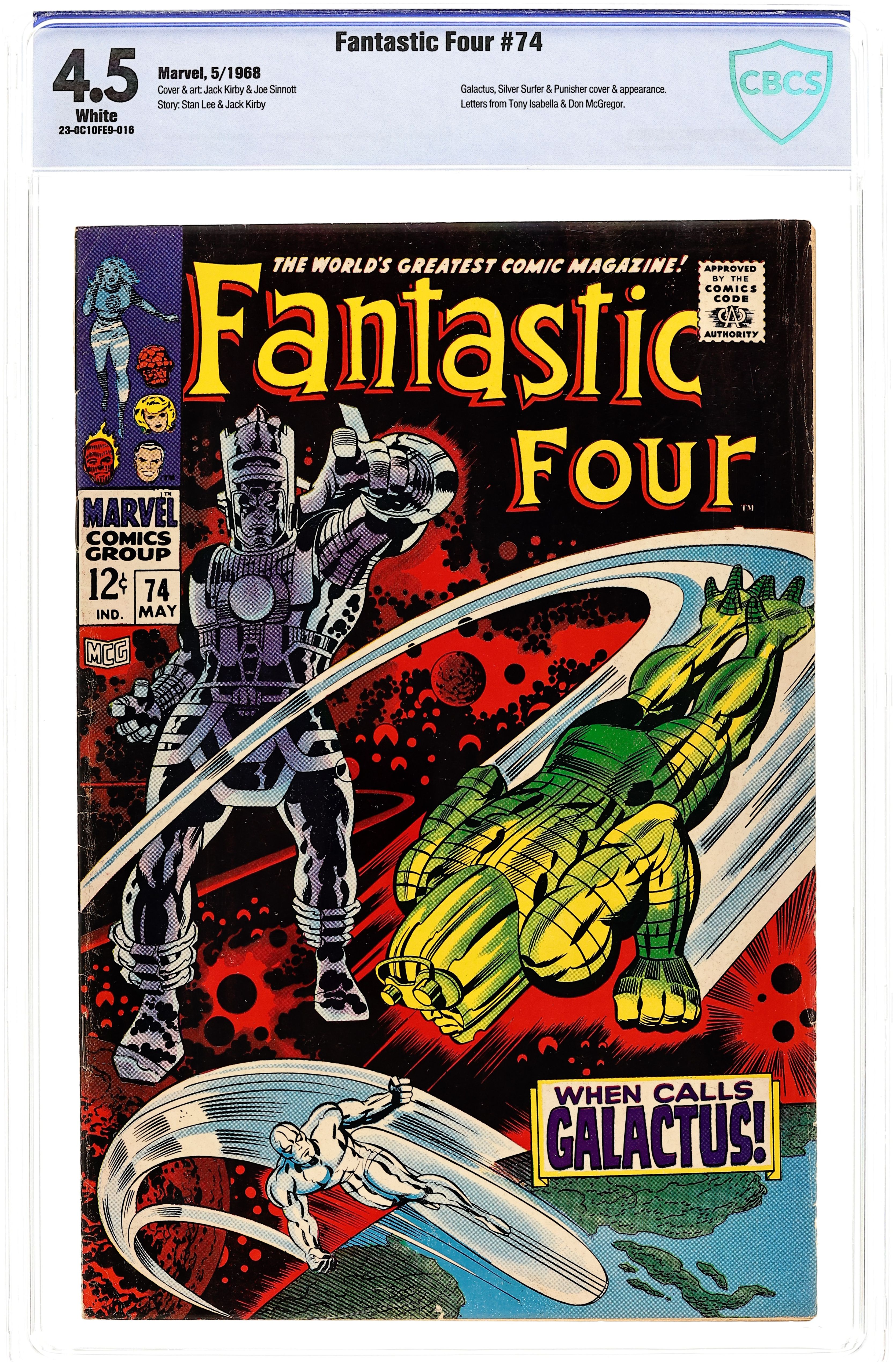 Cover pencils by Jack Kirby, inks by Joe Sinnott. The Silver Surfer, Galactus, and Crystal (of the Inhumans) guest star in When Calls Galactus, script by Stan Lee and Jack Kirby (co-plot), pencils by Jack Kirby, inks by Joe Sinnott; Galactus dispatches his Punisher to retrieve the Surfer who is protected by the FF. Letters to the editor from comics writers Don McGregor and Tony Isabella. Kirby/Sinnott cover. Reprinted in Marvel's Greatest Comics # 56. 36 pgs. Cover price $0.12.