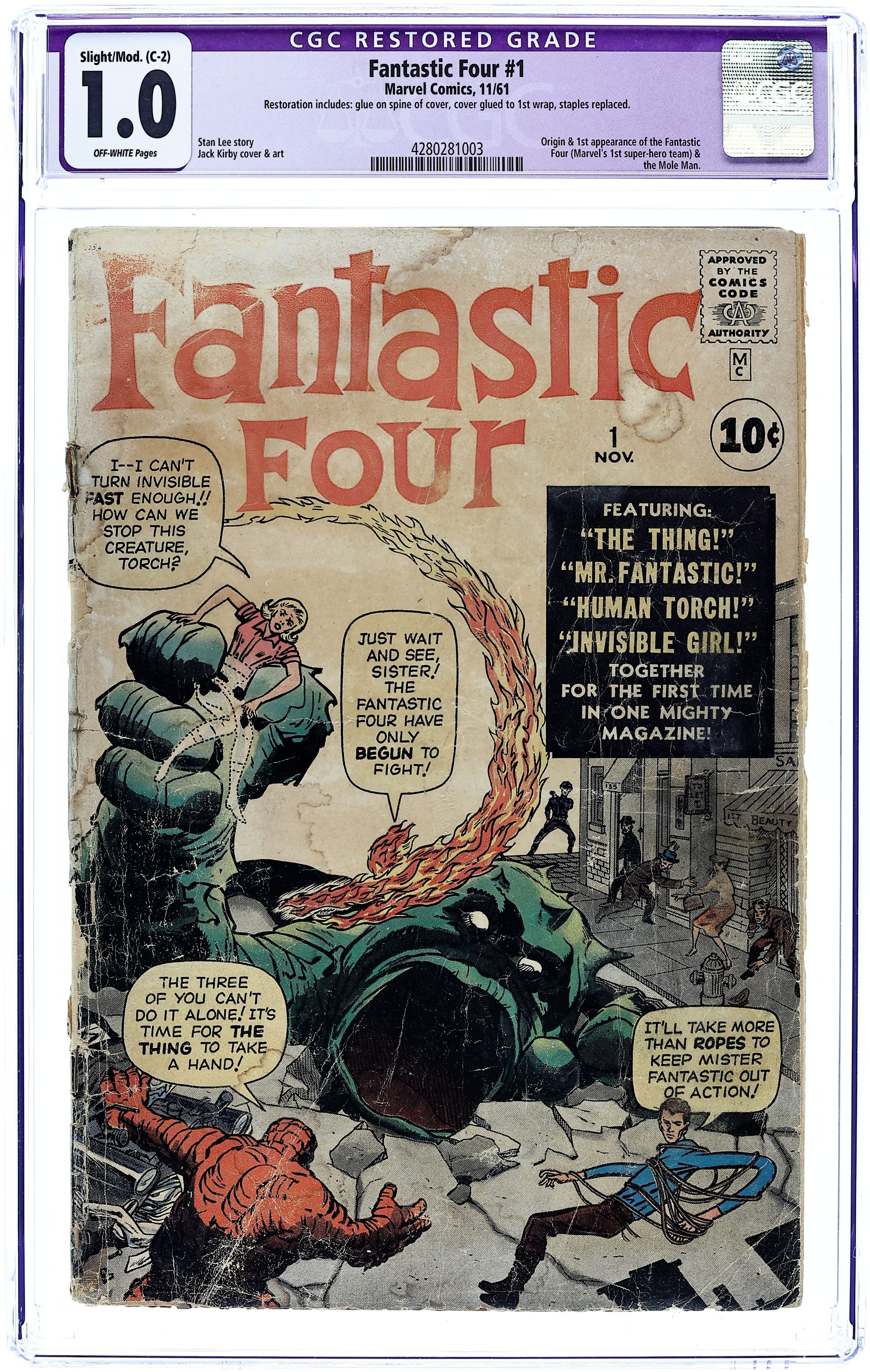 Cover pencils by Jack Kirby, inks by George Klein. The issue that started the Marvel Age of comics. First appearance of Mr. Fantastic, the Thing, the Human Torch (Johnny Storm), and the Invisible Girl as they battle the Mole Man in "The Fantastic Four!", script by Stan Lee, pencils by Jack Kirby, inks by George Klein; Dr. Reed Richards takes his friends on a rocket trip that changes their lives forever. The Fantastic Four Meet the Mole Man!, script by Stan Lee, pencils by Jack Kirby, inks by George Klein; Atomic plants disappear all around the world; Reed Richards pinpoints a place which is at the same distance from them all: Monster Isle. The Moleman's Secret!, script by Stan Lee, pencils by Jack Kirby, inks by George Klein; Having captured the Fantastic Four, Moleman recounts how he discovered his underground kingdom. 36 pgs. $0.10. Cover price $0.10.