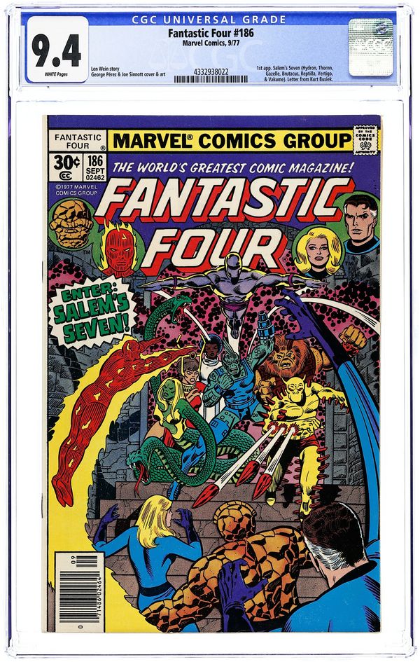 "Enter: Salem's Seven!" Written by Len Wein. Pencils by George Perez. Inks by Joe Sinnott. Cover by George Perez and Joe Sinnott. The Fantastic Four faces three daunting tasks! First, stop the planned execution of Agatha Harkness; second, find and rescue Franklin; and third, defeat a new group of super villains...the Salem Seven! How will the FF match up against Brutacus, Gazelle, Hydron, Reptilla, Thornn, Vakume, and Vertigo? Hopefully, it's favorable; otherwise everything will be lost!. Cameo appearance by the Impossible Man. Notes: Nicholas Scratch and the Salem Seven return in Fantastic Four Annual 14. The letters page contains a letter from comics writer Kurt Busiek. A 35-cent cover price variant exists for this issue. First appearance of the Salem Seven. 36 pgs. Cover price $0.30.