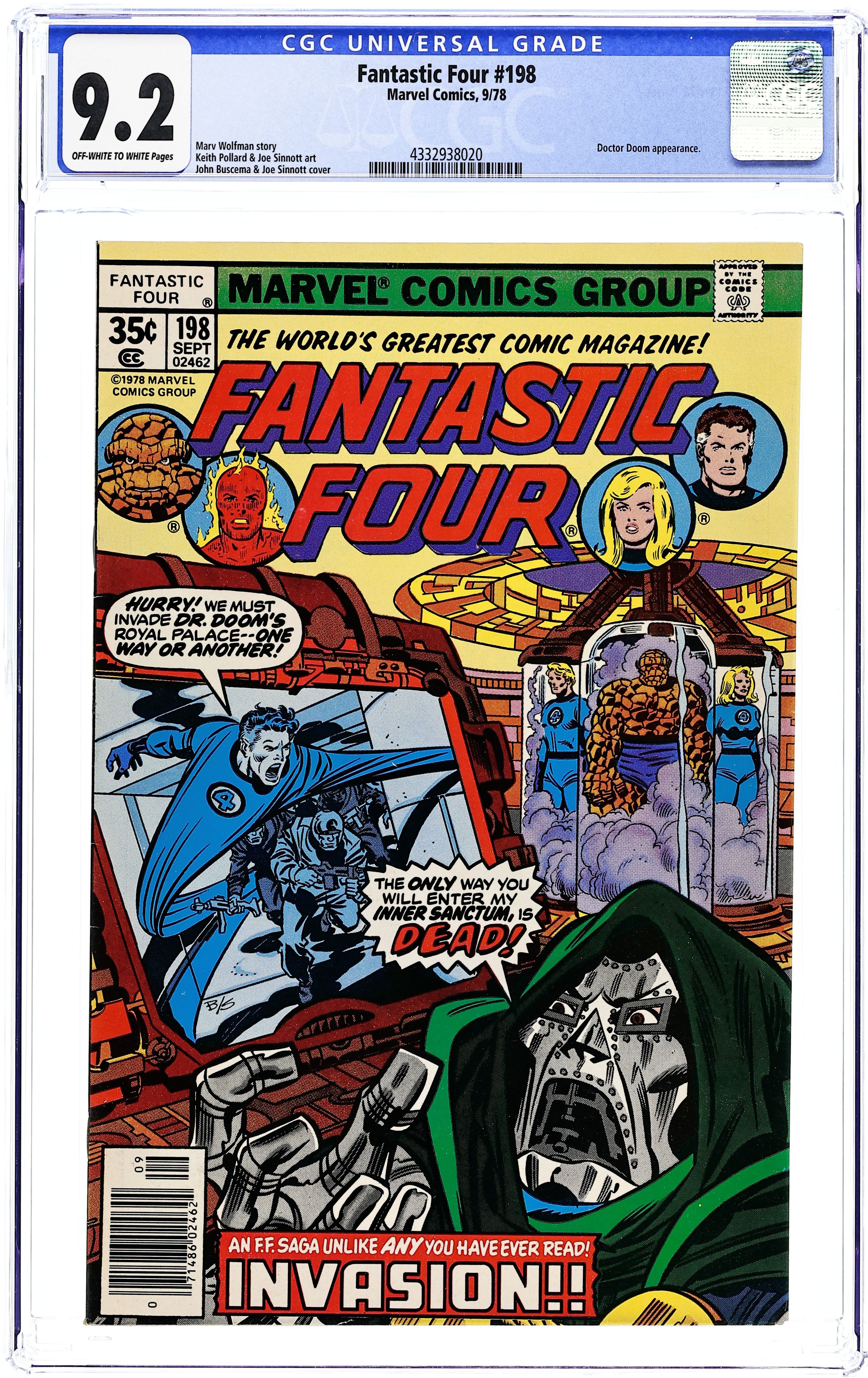 "The Son of Doctor Doom!" Script by Marv Wolfman. Art by Keith Pollard (breakdowns) and Joe Sinnott (finishes). Cover by Keith Pollard and Joe Sinnott. The FF are helplessly imprisoned in Dr. Doom's transference globes while their powers are transferred into the body of Victor Von Doom the second! While the transfer takes place, the people's rebellion, lead by Zorba, grows outside Doom's castle! It looks like the invincible Doctor Doom is in supreme control, but when the Fantastic Four break out, Zorba breaks in, and Doom's son breaks down...the good doctor is under attack from all sides! 36 pages Cover price $0.35.