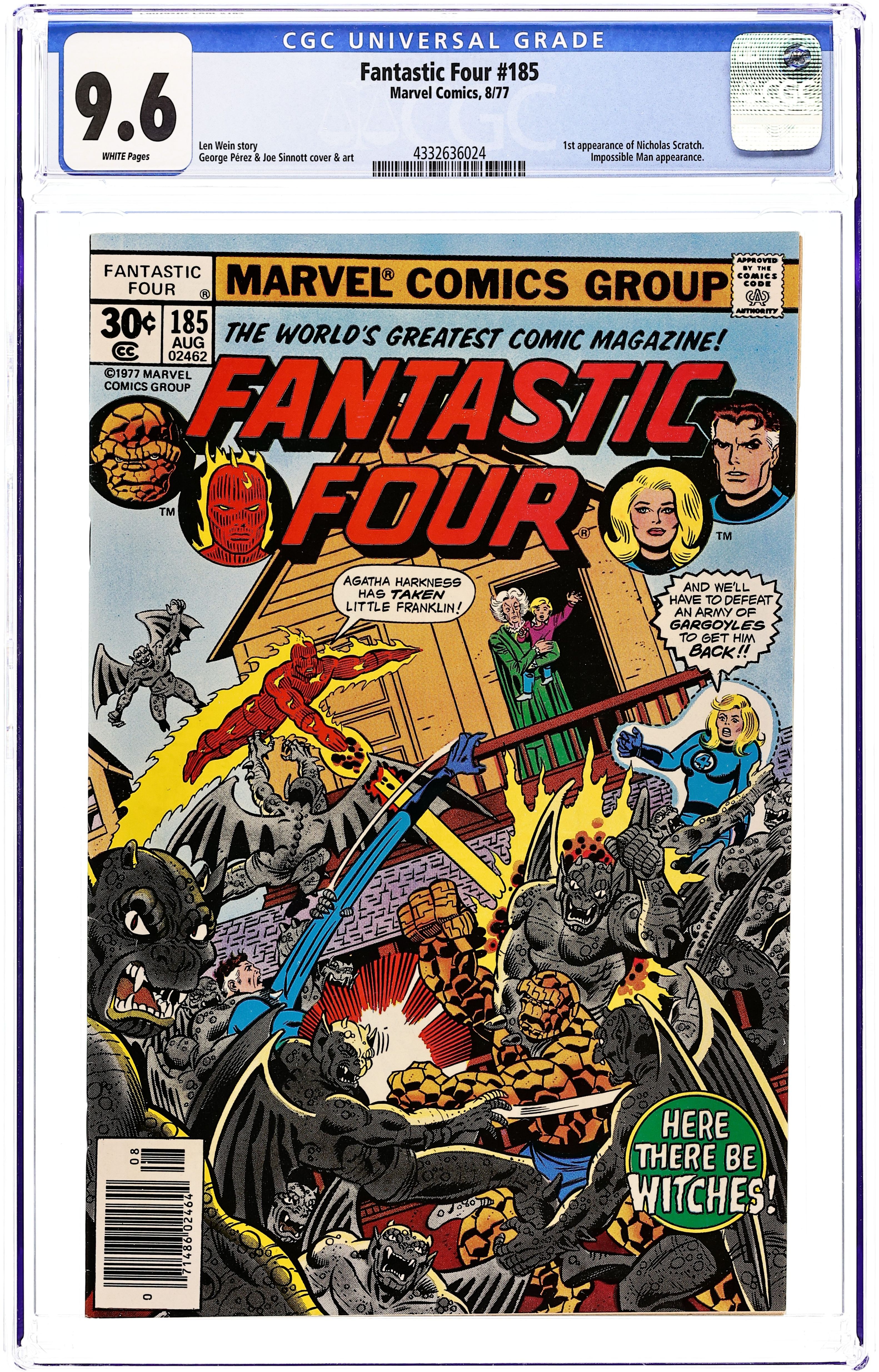"Here There Be Witches!" Written by Len Wein. Pencils by George Perez. Inks by Joe Sinnott. Cover by George Perez and Joe Sinnott. The Fantastic Four hop in the pogo-plane and fly to New Salem, Colorado in search of young Franklin. The quaint little town of New Salem seems very quiet and peaceful upon the FF's arrival, but appearances can be deceiving! One thing leads to another, and the fabulous foursome find themselves knee deep in gargoyles and witches! Cameo appearance by the Impossible Man. Note: A 35-cent cover price variant exists for this issue. First appearance of Nicholas Scratch. 36 pgs. Cover price $0.30.