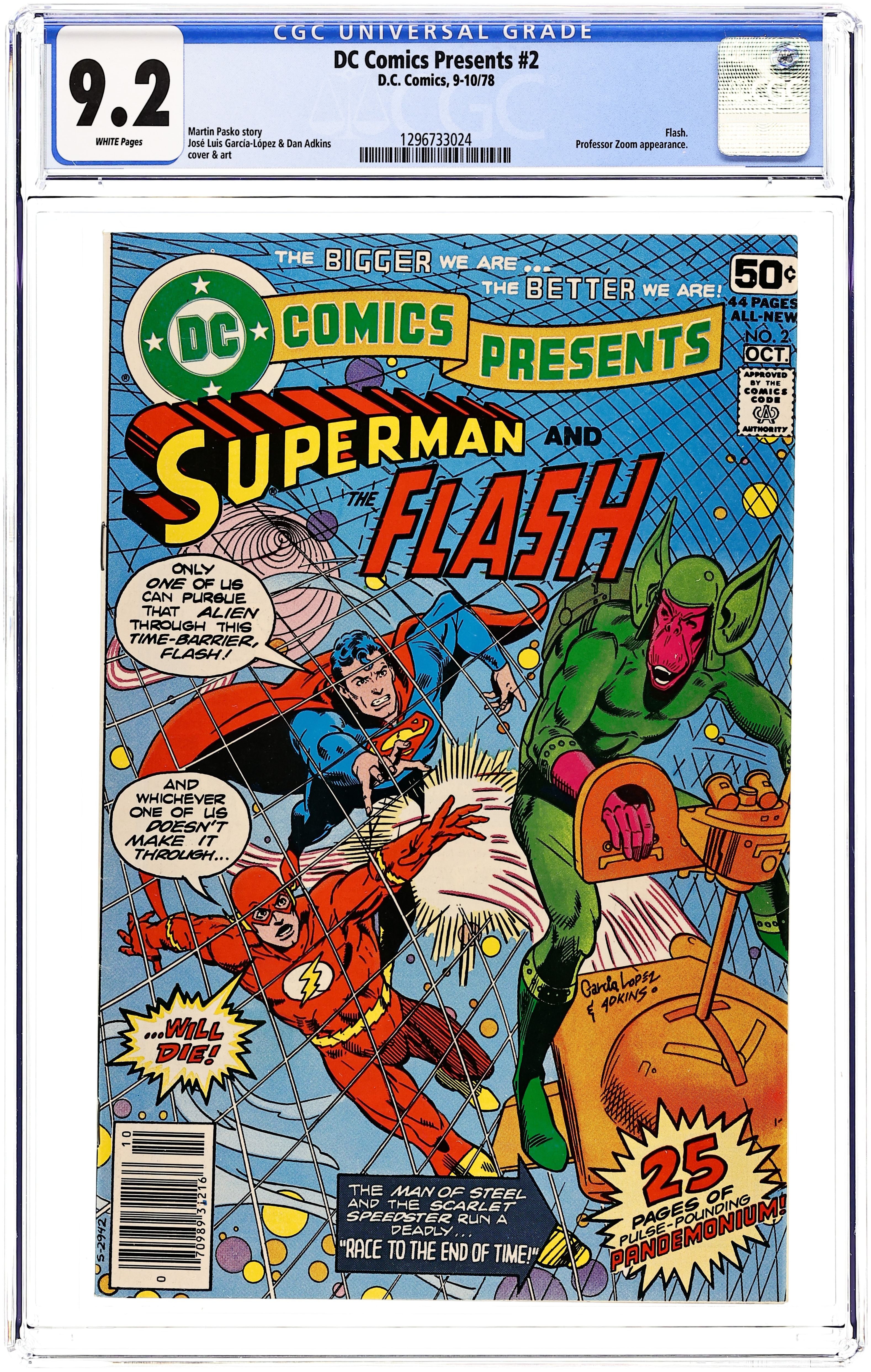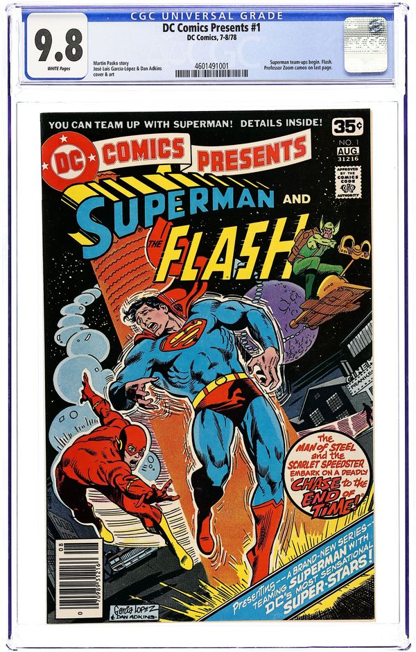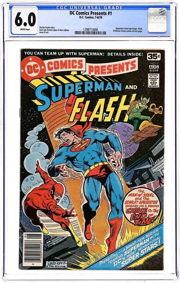 Cover pencils by Carmine Infantino, inks by Murphy Anderson. 1st appearance of Reverse Flash in Menace of the Reverse Flash, script by John Broome, pencils by Carmine Infantino, inks by Joe Giella; A time capsule sent directly to the future results in the creation of a new menace for the Flash...Professor Zoom, the Reverse-Flash. Palisades Amusement Park ad with Superman. 36 Pages, Full Color. Cover price $0.12.