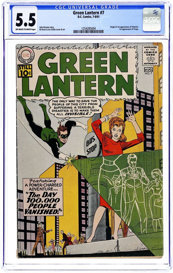 Origin and first appearance of Sinestro. Cover pencils by Gil Kane, inks by Joe Giella. The Day 100,000 People Vanished!, script by John Broome, pencils by Gil Kane, inks by Joe Giella; In an attempt to capture Green Lantern, Sinestro captures 100,000 people from the town of Valdale; The Guardians warn Green Lantern of Sinestro's plan and Green Lantern travels to Qward to rescue the citizens of Valdale. Wings of Destiny!, script by John Broome, pencils by Gil Kane, inks by Joe Giella; Green Lantern accidentally changes Pieface into a bird while Green Lantern is having a dream. Later Green Lantern has to meet Terga at the airport and stop a hijacking. 36 pgs. $0.10. Cover price $0.10.