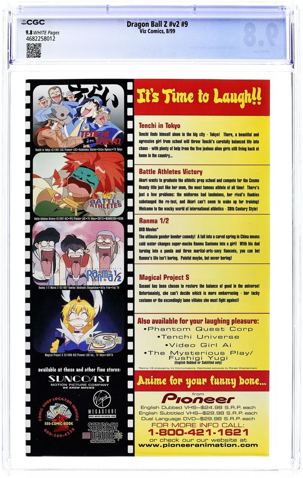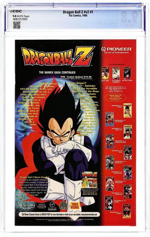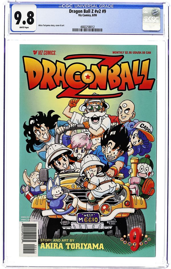 1st printing. Story and Art by Akira Toriyama. Fast forward to the future of the Dragon Ball world, as seen in America's most popular anime TV series! While Bulma converts Raditz's power-detector to work in English, Goku reaches the end of Snake Way and meets the most powerful martial artist in the afterlife. He's the one who'll train Goku to be really strong - under 10 times Earth's gravity! 32 pages, B&W. Cover price $2.95.