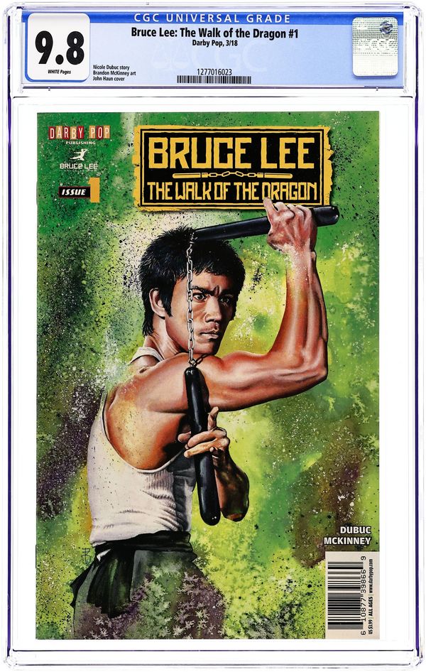 Written by Nicole Dubuc. Art by Brandon McKinney and Zac Atkinson. Cover by John Haun. Philosopher/teacher/real-life superhero Bruce Lee is back. And, let's be honest, the world needs him now more than ever. Taking a brief respite from battling an otherworldly evil, Bruce Lee attempts to navigate modern-day Southern California despite still suffering from amnesia and having been 'out of the loop' for over 45 years. Unfortunately, what was supposed to be a simple 'lunch run' soon turns into a comedy of errors involving mistaken identity, a Film Festival,' and the pokey. And despite never being one to initiate fisticuffs, Bruce continues to find it difficult to both hide his martial arts skills - and keep his shirt on. 28 pages, full color. Cover price $3.99.