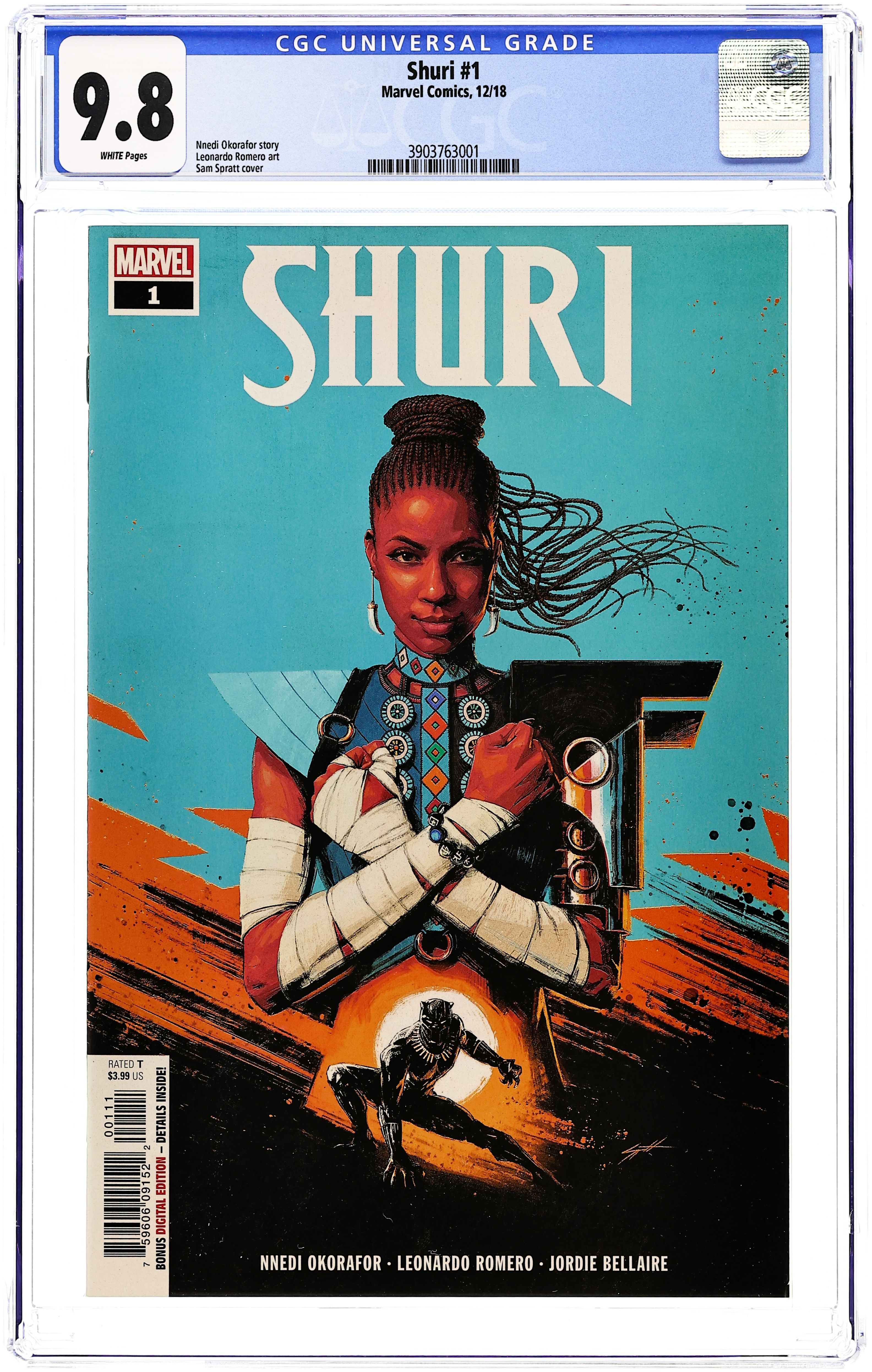 Written by Nnedi Okorafor. Art by Leonardo Romero. Cover by Sam Spratt. FOLLOWING IN THE FOOTSTEPS OF THE BLACK PANTHER! The world fell in love with her in the movie. Now, the Black Panther's techno-genius sister launches her own adventures - written by best-selling Afrofuturist author Nnedi Okorafor and drawn by Eisner-nominated artist Leonardo Romero! The Black Panther has disappeared, lost on a mission in space. And in his absence, everyone's looking at the next in line for the throne. But Shuri is happiest in a lab, surrounded by gadgets of her own creation. She'd rather be testing gauntlets than throwing them. But a nation without a leader is a vulnerable one - and Shuri may have to choose between Wakanda's welfare and her own. 28 pages, full color. Rated T Cover price $3.99.