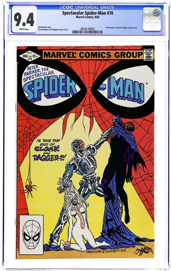 Direct Edition. "Cloak and Dagger!" Script by Bill Mantlo. Pencils by Ed Hannigan. Inks by Al Milgrom. Cover by Ed Hannigan and Al Milgrom. On a quiet night in Manhattan, the web-slinger is traveling across the city when he suddenly hears a desperate plea for help from a man running for his life! The frantic pharmacist is trying to escape from...Cloak and Dagger! The wall-crawler quickly engages the light-and-dark pair, but falls in battle to the duo's unusual powers. The next day Peter Parker picks up the investigation, and the trail of Cloak (aka Tyrone Johnson) and Dagger (aka Tandy Bowen) leads to Ellis Island! Is the Spectacular Spider-Man ready for round two with Cloak and Dagger? First appearance of Cloak and Dagger. (Notes: This issue includes a full-page ad/pin-up of Spider-Man fighting Dr. Octopus and promoting his four monthly titles. Bill Mantlo's script provides a nice history of Ellis Island. On page two Jim Mooney is erroneously listed as the inker. Al Milgrom is acknowledged as the correct inker in the letters page of issue 68. The back cover contains a Dungeons and Dragons ad with art by Bill Willingham. Cloak and Dagger appear next in Spectacular Spider-Man 69 and 70.) 32 pages Cover price $0.60.