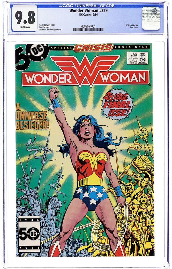 Crisis crossover. Last issue in this series. Cover by Jose Luis Garcia-Lopez. "Of Gods and Men," script by Gerry Conway, art by Don Heck; After meeting with both the Anti-Monitor and Mars, Hades agrees to help his newfound allies against the Olympian gods and Amazons; On Paradise Island, despite Wonder Womans encouragement, Hippolyte sees devastation and refuses to try to continue; But Kore appears to both Amazons and tells them Hades, her husband, has fallen in with the Anti-Monitor, and both of them will find no respite in the underworld; At that point, the dead Amazons are reanimated by Hades, turned into zombies, and sent against Hippolyte, Wonder Woman, and Kore, but Diana defeats them and Kore sends them back to Hadess realm. On Earth, Lauren Haley dies as she falls in a crevasse; Wonder Woman returns to Washington, D.C. and reunites with Steve Trevor; They kiss, embrace, and declare their love for each other, leaving Etta alone with Howard; Howard admits he is in love with Etta, and she says that she has a feeling they will never see Wonder Woman or Steve again; Steve heads for Olympus with Wonder Woman in the Robot Plane; On Olympus, Wonder Woman, Steve, and Hippolytas Amazons face Mars and his zombie legions. 52 pages, Full Color. Cover price $1.25.