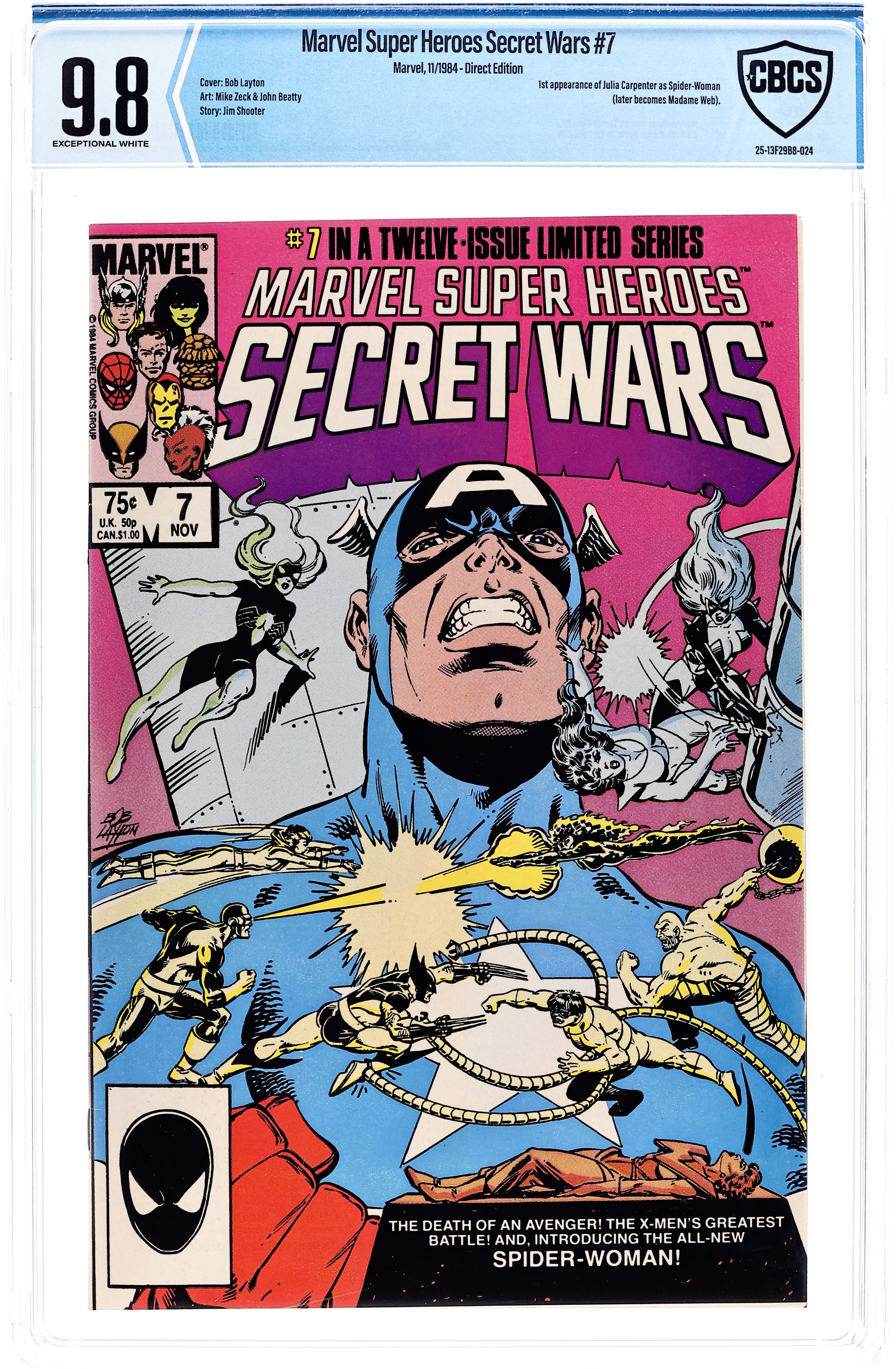 Direct Edition. 1st appearance of Spider-Woman II (Julia Carpenter). "Berserker!" Part 7 of 12. Story by Jim Shooter. Art by Mike Zeck and John Beatty. Introducing Marvel's newest super-hero, Spider-Woman, a refugee from the displaced Denver, Colorado (NOTE: The Beyonder created Battleworld from pieces of hundreds of worlds from across the universe, Denver was one of those pieces). Plus, when the villains dump the Wasp's lifeless body into the heroes' camp, the Savage She Hulk decides to pay the bad guys a visit for some payback. But, has the emerald heroine finally bitten off more than she can chew? 36 pages, full color. Cover price $0.75.