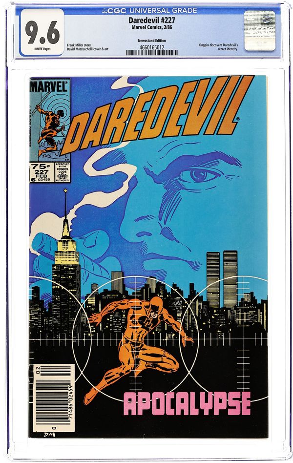 Newsstand Edition. First 75-cent cover price. Cover art by David Mazzucchelli. Apocalypse, script by Frank Miller, art by David Mazzucchel; Karen Page sells Daredevil's secret identity for a drug fix; Kingpin buys the name and proceeds to wreck Matt Murdock's life; part 1 of critically acclaimed Born Again storyline. 36 pgs. Cover price $0.75. Cover price $0.75.