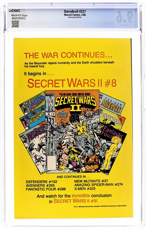 Newsstand Edition. Cover art by John Byrne. The Price starring Daredevil, the Beyonder, Glorianna O'Breen, Foggy Nelson, Becky Blake, and Skeeter Pretzel (1st), script by Denny O'Neil by Jim Shooter, pencils by David Mazzucchelli, inks by Kim DeMulder; The Beyonder gives Matt his sight back, and DD threatens to sue him unless he takes it away again. Continued from Secret Wars II #3. 36 pgs. Cover price $0.65. Cover price $0.65.