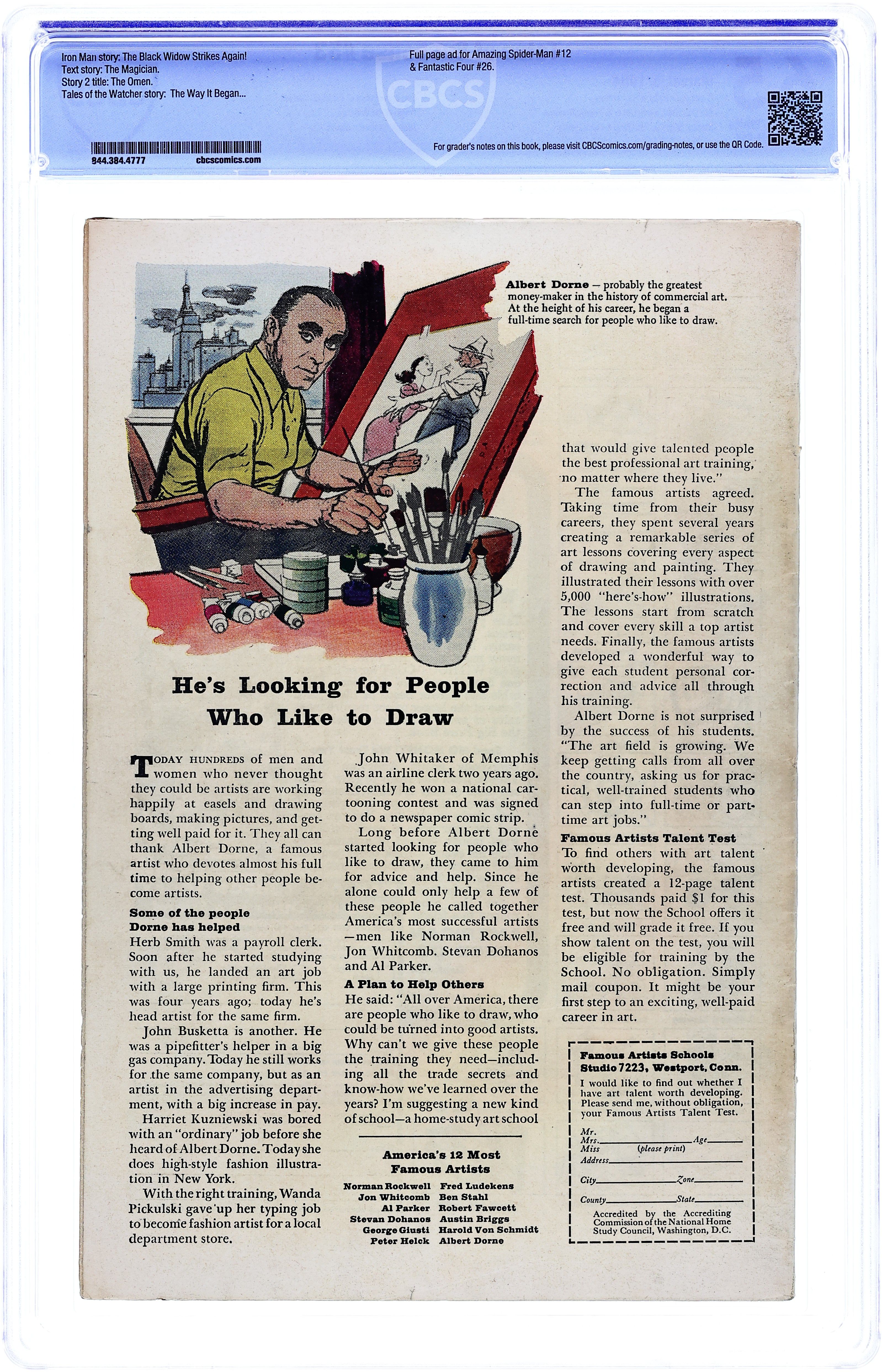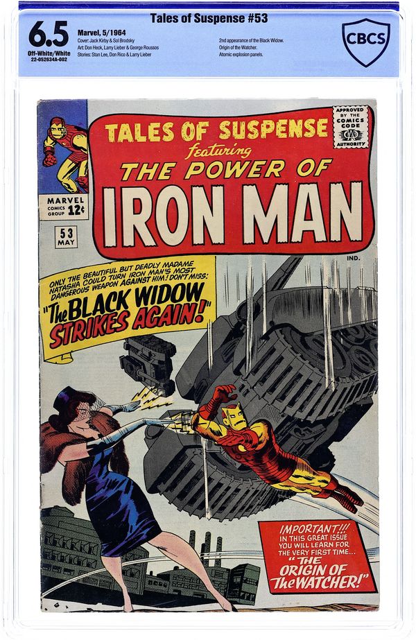 Cover pencils by Jack Kirby, inks by Sol Brodsky. Second appearance of the Black Widow in "The Black Widow Strikes Again!", script by Stan Lee (plot) and Don Rico (as N. Korok), art by Don Heck; To redeem herself in the eyes of the communist leader, Black Widow steals the new anti-grav ray device developed by Tony Stark and attacks Fort Knox; Iron Man destroys the ray device, but the Black Widow escapes. "The Magician" text story. "The Omen," script by Stan Lee (plot) and Larry Lieber (script), pencils by Larry Lieber, inks by George Roussos (as George Bell); A superstitious warlord thinks a flare of light is a good omen for an invasion, but when it is discovered to be a meteor his entire world must evacuate in order to survive. The Watcher origin in the fifth Tales of the Watcher, "The Way It Began," script by Stan Lee (plot) and Larry Lieber (script), pencils by Larry Lieber, inks by Paul Reinman; The Watcher comes from a super-advanced race that decides to share its technology with others; When their first attempt ends in tragedy, they vow never to interfere with the affairs of less advanced species. The second half of "The Magician" (text story). 36 pages, full color. Cover price $0.12.