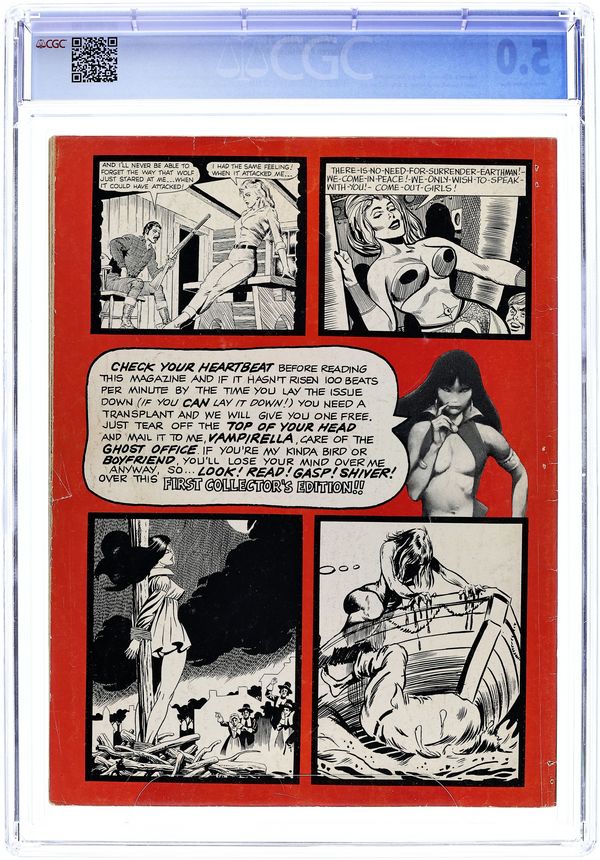 Stories in this issue include: "Vampi's Feary Tales: Queen of Outer Space"; "Evil: Wicked is who Wicked Does" (starring Vampirella's cousin); "Blast off to a Nightmare"; "Eleven Footsteps to Lucy Fuhr"; "I Wake Up...Screaming" (featuring the likenesses of several movie stars); "The Caliegia"; "Didn't I See You on Television?"; and "A Slimy Situation." Written by Forrest J Ackerman, Bill Parente, Al Hewetson, Terri Abrahms, and others. Art by Billy Graham, Dick Piscopo, Tom Sutton, and others. Includes letter by future comic book writer Doug Moench. Cover art by Vaughn Bode and Larry Todd. 68 pages, B&W. Cover price $0.50.