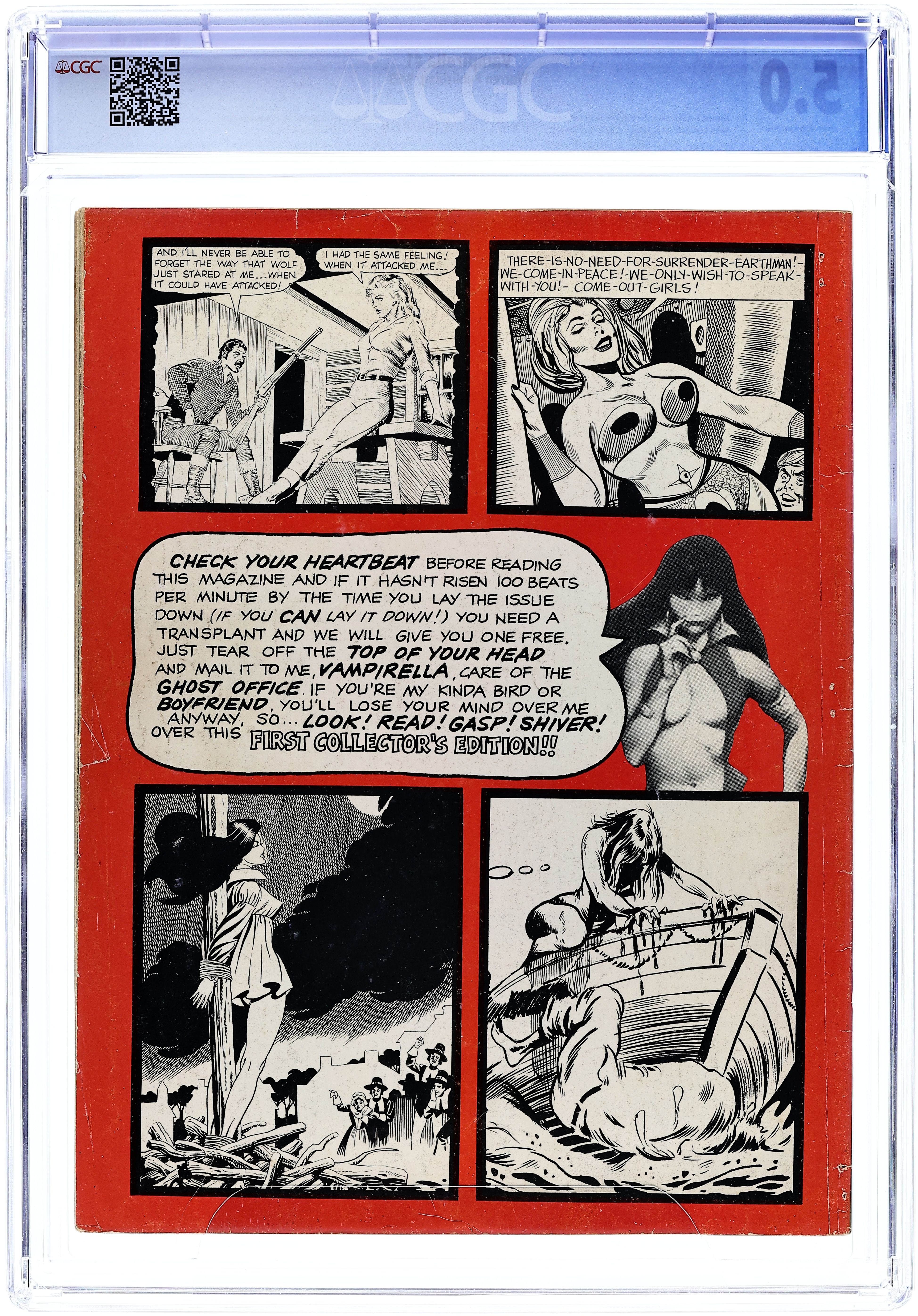 Stories in this issue include: "Vampi's Feary Tales," "Evily" (starring Vampirella's cousin); "Montezuma's Monster"; "Down to Earth" (with cameos by Forry Ackerman and James Warren); "Queen of Horror"; "The Octopus"; "One, Two, Three" (a robot tale); and "Rhapsody in Red." Written by Forrest J Ackerman, Nicola Cuti, Don Glut, Bill Parente, and R. Michael Rosen. Art by William Barry, Ernie Colon, Billy Graham, Mike Royer, Jerry Grandenetti, Dick Piscopo, and Tony Williamsune. Cover art by Bill Hughes. 68 pages, B&W. Cover price $0.50.