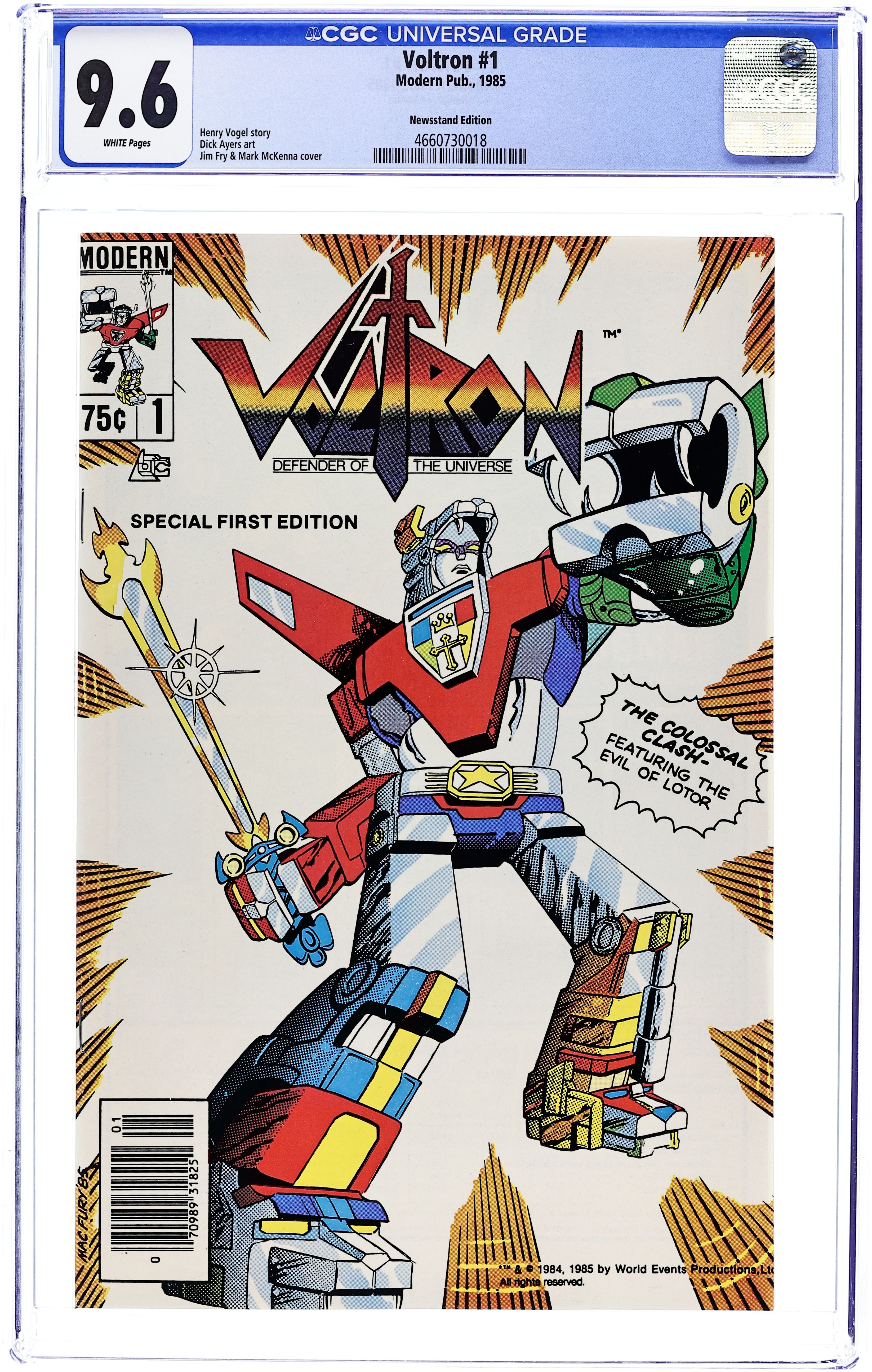 Direct Edition. "Will Power!" Written by Henry Vogel. Art by Dick Ayers. The sinister Prince Lotor and the cruel witch Haggar conceive a diabolical plot to mind control the leader of the Voltron Force, Keith. Can Keith resist their evil power or is this the end of Voltron?! 32 pages, FC. Cover price $0.75.