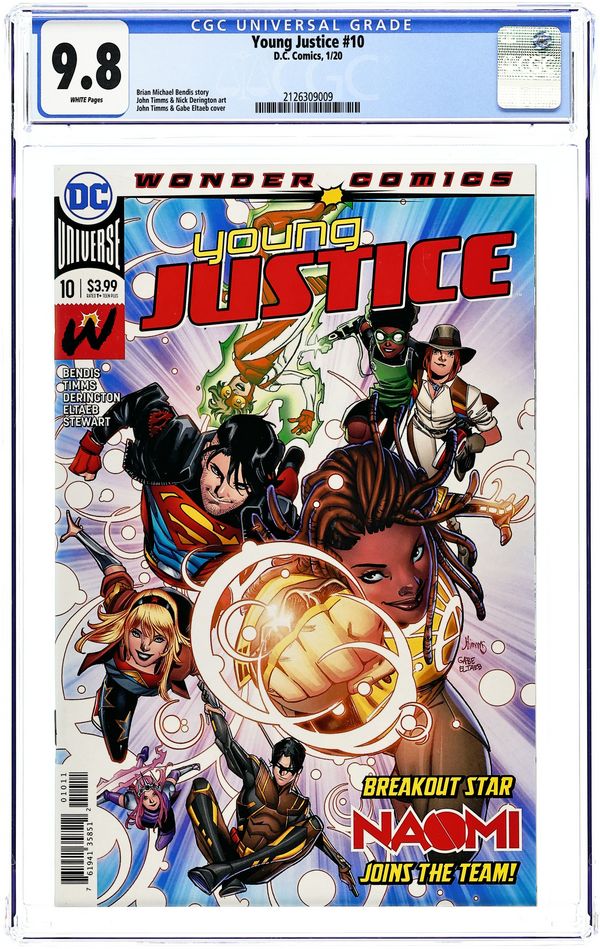 Written by Brian Michael Bendis. Art by John Timms and Nick Derington. Cover by John Timms. Welcome, Naomi! Wonder Comics' brightest shining star comes to Young Justice! She's ready to join this team of young heroes who have seen it all-and you'll want to be here to watch the sparks fly for the very first time. All this, plus the true story of Jinny Hex. 32 pages, full color. Rated T+ Cover price $3.99.