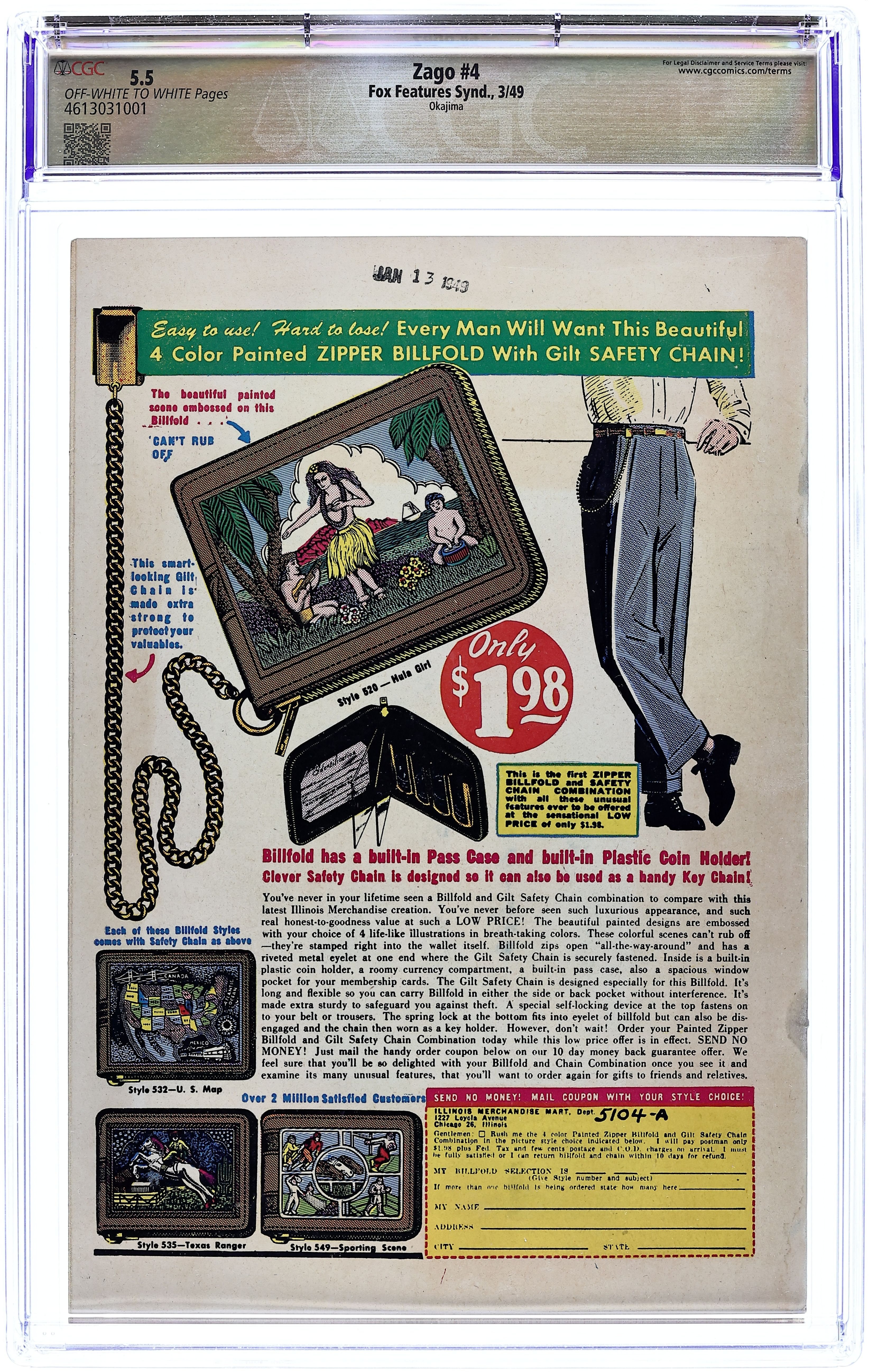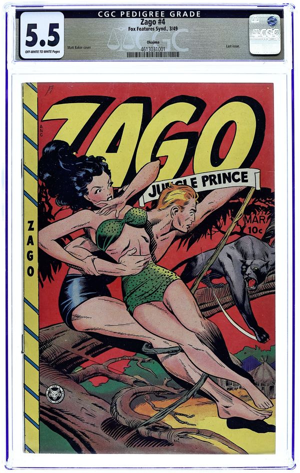 In order of appearance: "Zago Jungle Prince"; "Tony Luck, Jet Junction!" art by Robert Webb, retitled and reprinted with alterations from "Lucky Wings, Japs and Jets", which is reprinted in Jerry Iger's Golden Features (1986) #3 and Wings Comics (1997) #1; "Blue Beetle, The Cobra's Kiss!"; and "Plaid Clad Terror!! Orgy Of Death!". "Poky Ridge Gold" text story reprinted in Hoot Gibson Western (1950) #6. Indicia states "ZAGO". 36 pages. Full color. Cover price $0.10.