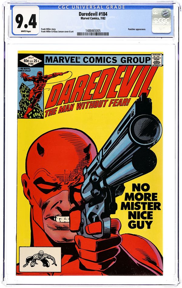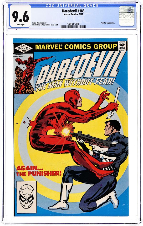 Ends Dec 15 8:06 PM CST Bid History 11 bids Current Bid $172 Your Secret Max Bid If you'd like to bid, please log in or register. Direct Edition. Cover pencils by Frank Miller, inks by Klaus Janson. Child's Play, script by Roger McKenzie and Frank Miller, pencils by Frank Miller (breakdowns) and Klaus Janson (finished art), inks by Klaus Janson; A young girl on drugs takes a dive out of her school window and dies, and her brother, DD and the Punisher are all trying to track down the dealer responsible; Matt proposes to Heather; Hogman [Peter Grunter] is the guest villain. The last few pages are probably penciled by Janson from Miller breakdowns. This story was originally scheduled for issue 167 but delayed because the Comics Code did not approve it in its original form. 36 pgs. Cover price $0.60. Cover price $0.60.