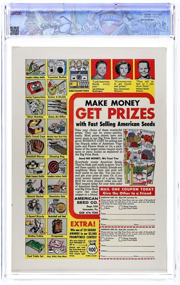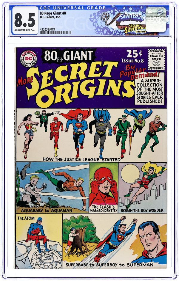 More Secret Origins 80-Page Giant. Reprints. Cover art by Murphy Anderson. "The Origin of the Justice League!", script by Gardner Fox, pencils by Mike Sekowsky, inks by Bernard Sachs; The Justice League of America uses the occasion of its third anniversary to tell Snapper Carr and Green Arrow about the formation of the League, involving the discovery of strange meteors that nearly doomed them forever. Ads for The Flash and Justice League of America. Ad for Hasbro's G. I. Joe. "Friends Across the Seas," script by Jack Schiff, art by Sheldon Moldoff; School children from around the world discuss letters from their pen-pals (promoting 1965 as International Cooperation Year). "Birth of the Atom!", script by Gardner Fox, pencils by Gil Kane, inks by Murphy Anderson; Scientist Palmer is experimenting with his reducer lens to try and reduce objects in size without blowing them up, all without success. The Atom ad. "Origins of Legendary Heroes" article; Mini biographies of legendary heroes through the ages. Half-page Little Pete story by Henry Boltinoff. "How Aquaman Got His Powers!", script by Robert Bernstein, art by Ramona Fradon; Aquaman stops the U.S. Navy from testing atomic depth charges and recounts his origin to Commander Haskel. Aquaman ad. "The Man from Robin's Past," script by Bill Finger, pencils by Sheldon Moldoff, inks by Charles Paris; When stolen goods are found in the quarters of Sando the Strongman, a friend of the Grayson family who looked after Dick after his parents were murdered, Batman and Robin have to prove his innocence. Detective Comics/Batman ad. "The Origin of Flash's Masked Identity!", script by John Broome, pencils by Carmine Infantino, inks by Joe Giella; Barry muses to himself, while reading a Golden Age issue of Flash Comics, of what it would be like if the Scarlet Speedster would operate maskless rather than as he now does. "The Story of Superman's Life!", script by Otto Binder, art by Al Plastino; Recap of Superman's life. World's Finest Comics ad. 84 pgs., full color. Cover price $0.25.