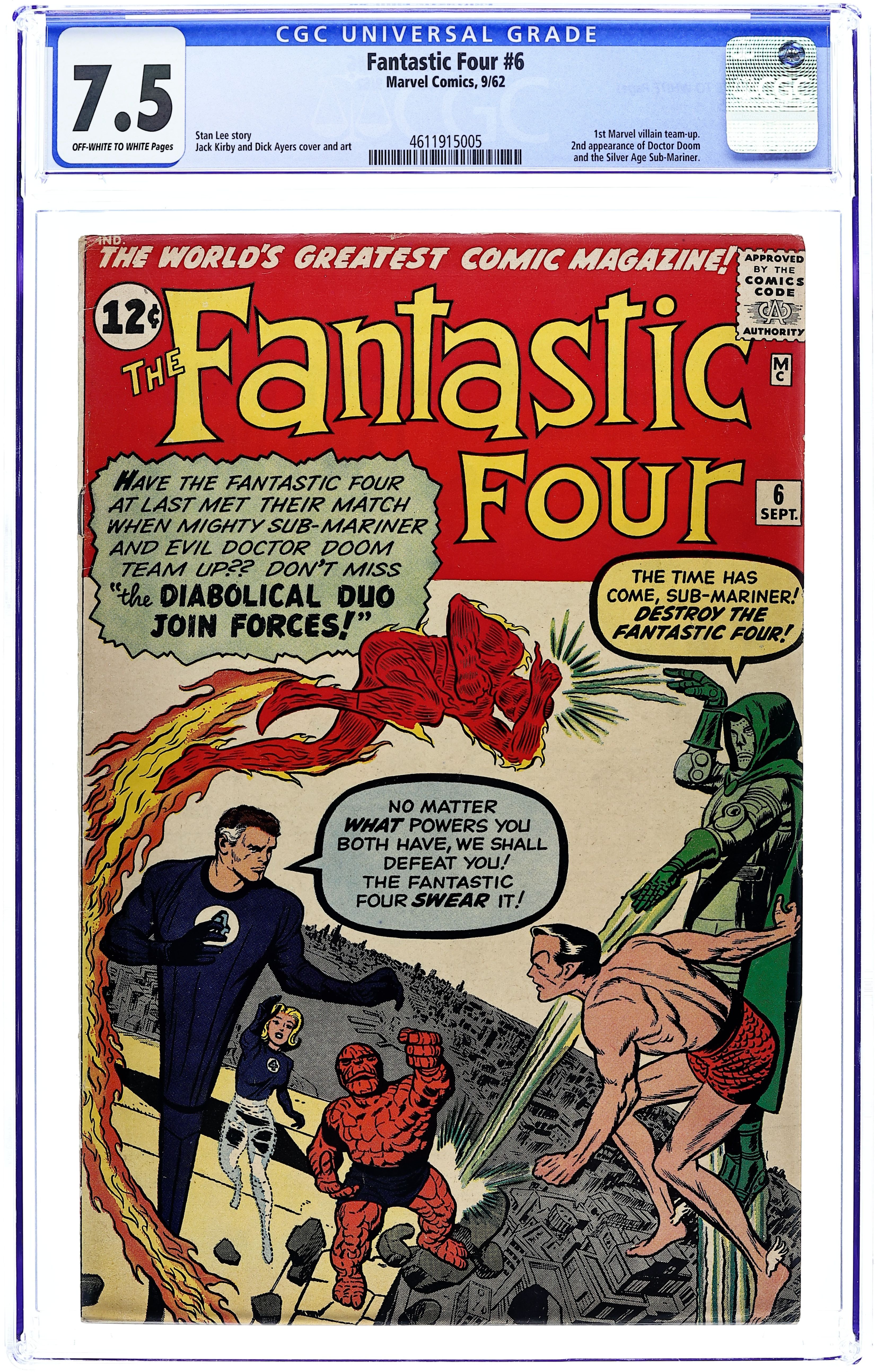 Cover pencils by Jack Kirby, inks by Dick Ayers. Dr. Doom and the Sub-Mariner team up (first Marvel villian team-up and second Silver Age Sub-Mariner appearance) in "Captives of the Deadly Duo!" Part 1, script by Stan Lee, pencils by Jack Kirby, inks by Dick Ayers; Doctor Doom presents himself to Sub-Mariner and offers him an alliance against the Fantastic Four and all mankind. When Super-Menaces Unite Part 2; Dr. Doom gives a "Grabber" to Sub-Mariner and Human Torch discovers that Invisible Girl hides a photo of the Sub-Mariner in a book. Part 3 When Friends Fall Out!; The Sub-Mariner plants the "Grabber" in the Baxter Building and it is lifted into space by Doctor Doom. Part 4 Trapped!; The Baxter Building is set on a collision course with the Sun and the Sub-Mariner discovers that Doctor Doom has betrayed him. Part 5 The End... or the Beginning?; Doctor Doom is flung out into space and the Baxter Building is returned to its foundation. First mention of "unstable molecules." 36 pgs. $0.12. Cover price $0.12.