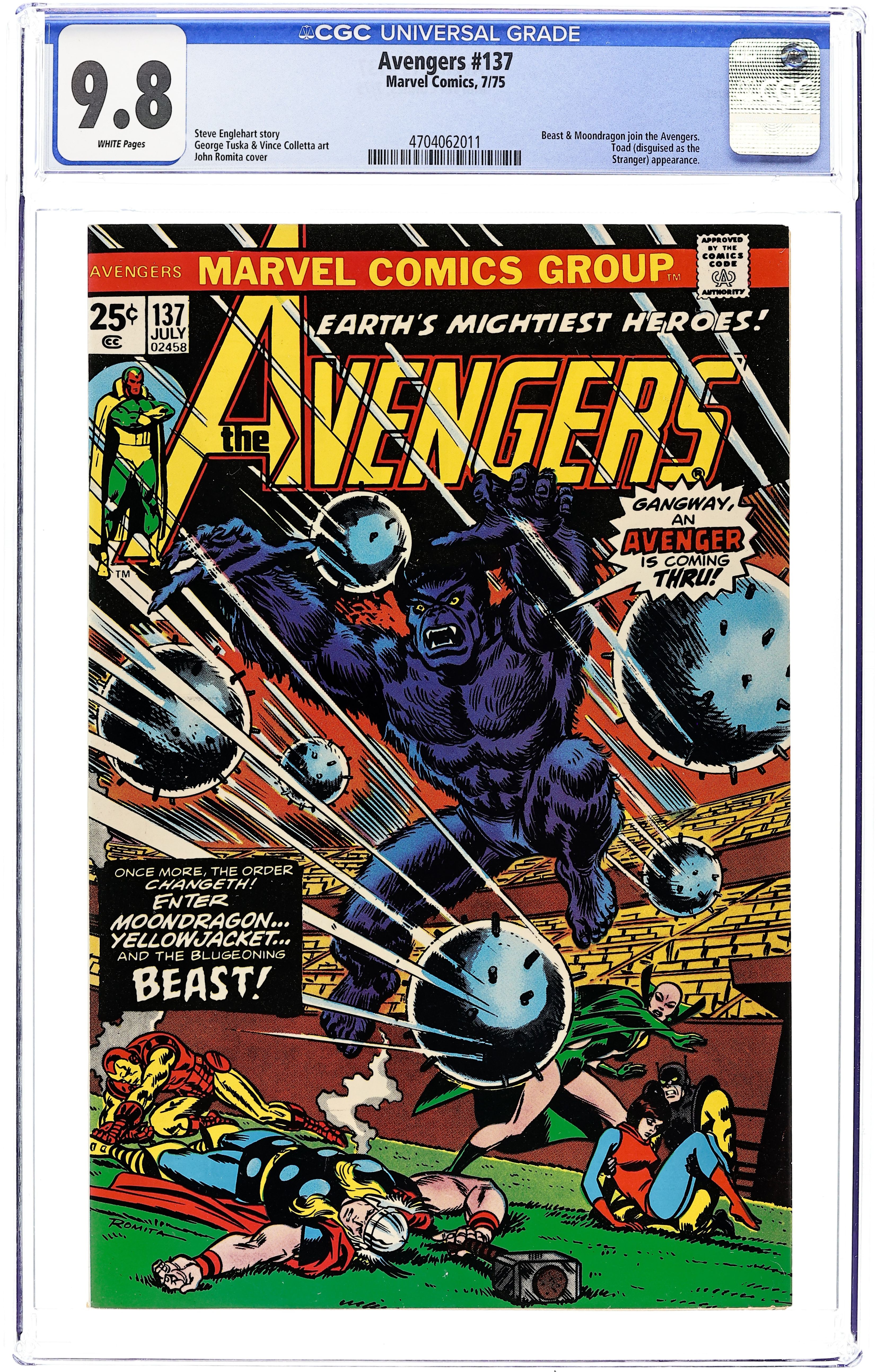 "The Gods and the Gang!" Part 7 of 7. Script by Steve Englehart. Pencils by George Perez. Inks by Sam Grainger. Cover by George Perez and Frank Giacoia (with touch-ups from John Romita). The Avengers return to the Brand Corporation facility on Long Island! And waste no time jumping into a brawl with Brand's private army! But Hugh Jones and Buzz Baxter have a secret weapon waiting for Earth's Mightiest Heroes...Orka, the human killer whale! Fortunately though, Moondragon and Thor have returned to New York following their Wild West adventure, and the two god-like avengers join the fight against Orka! Two fantastic battles will determine if the Avengers live or die: the thunder god vs. Orka...and Hellcat vs. Buzz Baxter! An awesome conclusion to the Serpent Crown saga! Cameo appearance by the Squadron Supreme. (Notes: Orka previously appeared in Sub-Mariner 67. This seven-part story was reprinted in 2005 in the trade paperback, Avengers: The Serpent Crown. The letters page includes a letter from comics artist Richard Howell. A 30-cent cover price variant exists for this issue.) 36 pgs. Cover price $0.25.