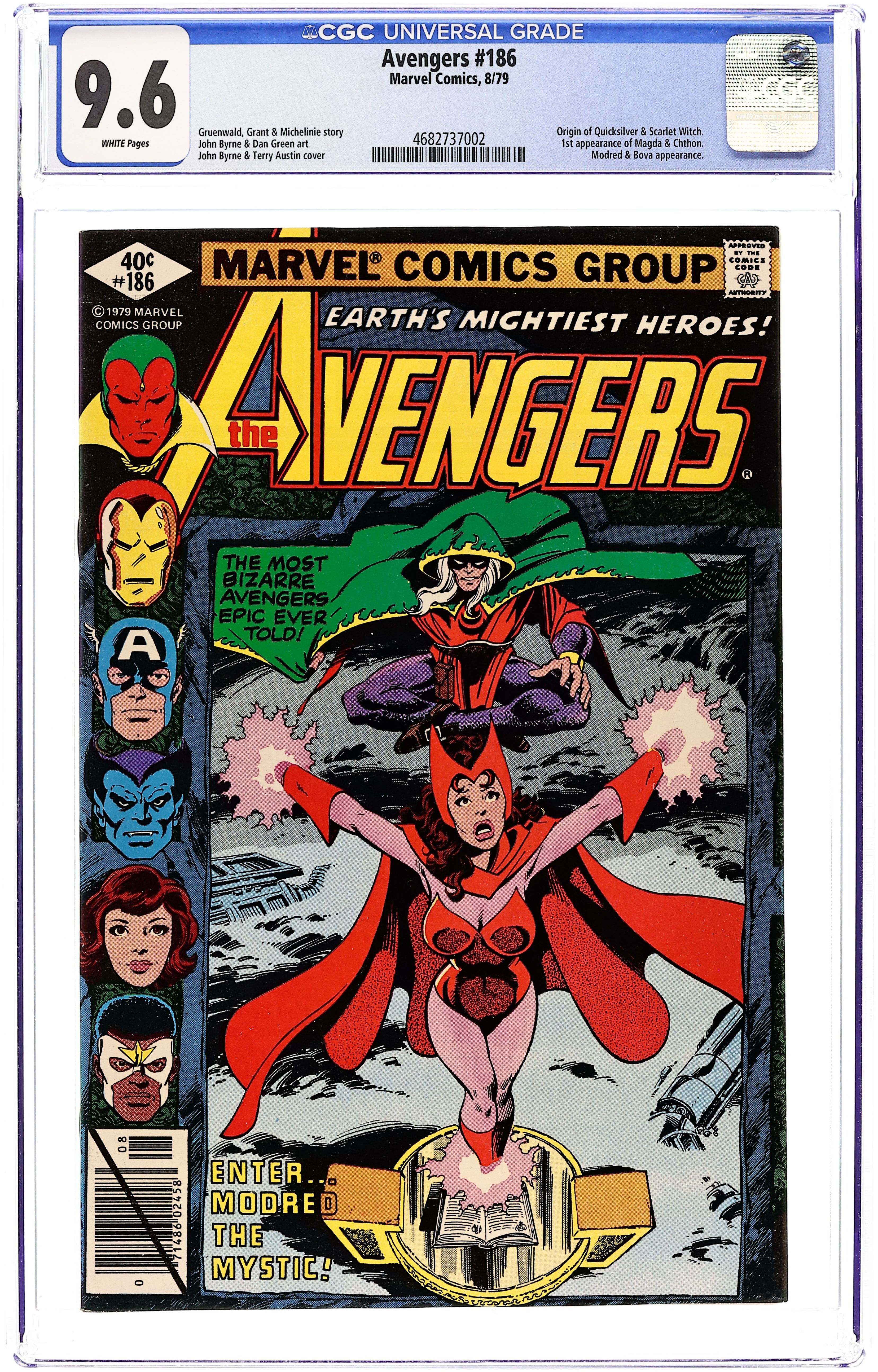 Direct Edition. "The Yesterday Quest!" Part 1 of 3. Plot by Mark Gruenwald and Steven Grant. Script by David Michelinie. Pencils by John Byrne. Inks by Dan Green. Cover by George Perez and Terry Austin. Ever since their first appearance in Uncanny X-Men 4 many years ago, the origin of Quicksilver and the Scarlet Witch has been a mystery to both comic readers and the siblings alike. After Wanda and Pietro arrive in Transia with Django Maximoff, clues to the twins' birthplace and birth parents begin to emerge. Modred the Mystic, the Darkhold, Bova the cow-woman, the High Evolutionary's former citadel, and Wundagore Mountain are all pieces to the puzzle. And the truth seems to lie at the top of the mountain. But there's something else at the top of Wundagore Mountain. Something ancient, something evil. Cameo appearance by Bova. Flashback cameos by Robert Frank, Madeline Frank, and the Toad. Avengers Lineup: Beast, Captain America, Falcon, Hawkeye, Iron Man, Jocasta, Ms. Marvel, Quicksilver, Scarlet Witch, Vision, and the Wasp. (Notes: Mark Gruenwald's participation in this three-part story was an indication of the storyline's importance to the continuity of the Marvel Universe. Modred previously appeared in Marvel Two-in-One 33. This issue includes a full-page ad for the Man-Thing's guest appearance in Micronauts 7.) 36 pages Cover price $0.40.