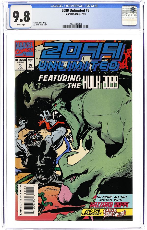 "Never Let Go," script by Gerard Jones, pencils by Joe Brozowski (as J.J. Birch), inks by Fred Harper; Hulk 2099 must rescue his sister Marian from a fake kidnapping by Vulx (a guy who looks a lot like Lobo.... Hmmmmmmm). "Everything you Always Wanted to Know About Duke Stratosphere but were Afraid to Ask," script by John Moore, art by Kyle Baker; The origin of Duke Stratosphere is told - or is it? "Now Playing," script by Michael Jan Friedman, pencils by Gino DeCicco, inks by Don Hudson; A Virtual Reality character is brought to life by ionic energy, and he goes after the director who "killed" him, and the corporations that control the people. 68 pgs., full color. Cover price $3.95.